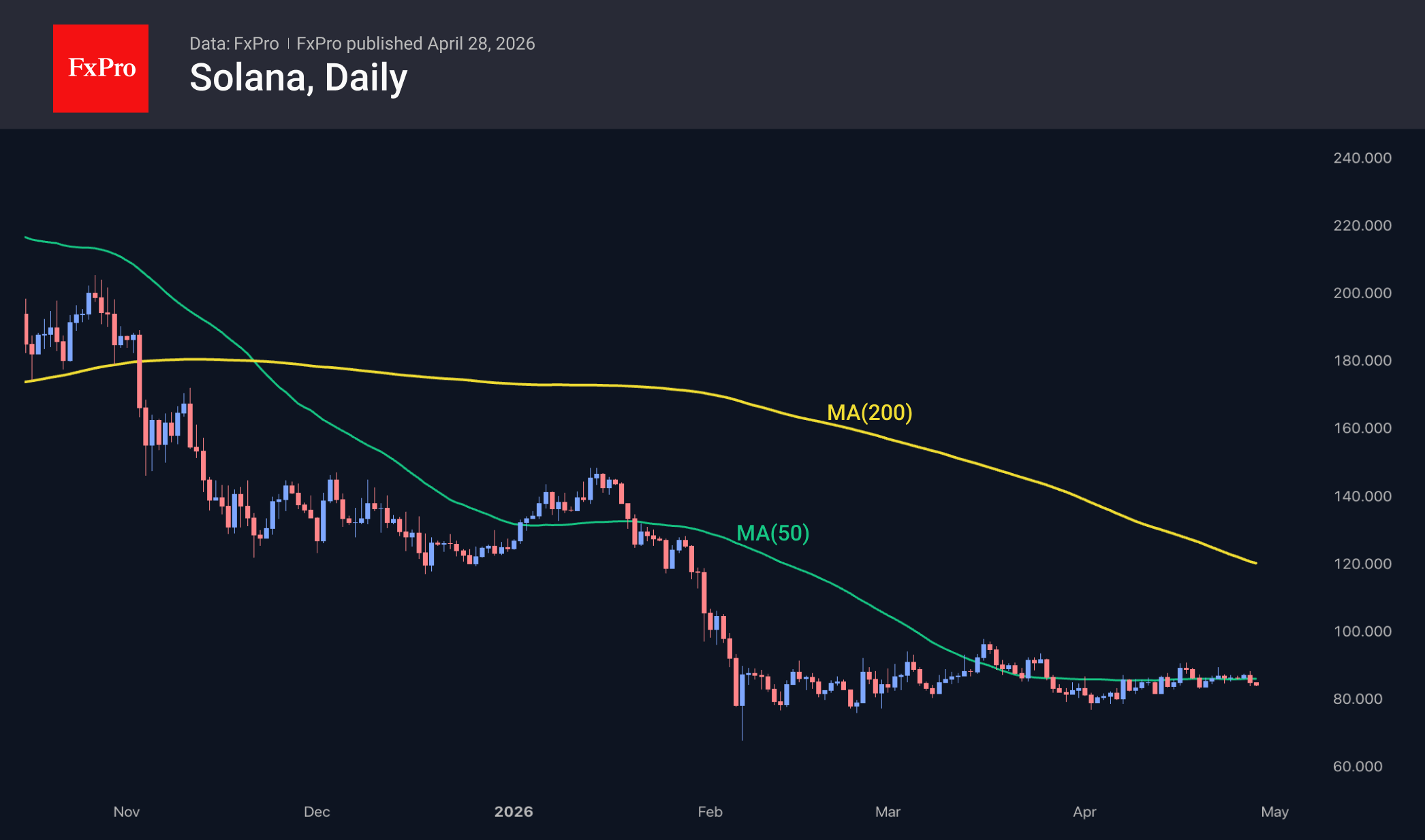 Bitcoin has fallen to $76.6K, where it last traded a week ago. Since late March, BTC’s price has been in a clear upward range, but we are now seeing an attempt to break through its lower boundary, potentially reversing or correcting the trend. A break of the trend will occur if prices fall below $75K, while a reversal to the upside from higher levels would merely be a correction within the uptrend. In this case, we should expect a swift retest of $80K and a likely acceleration of the rally should this resistance be broken.