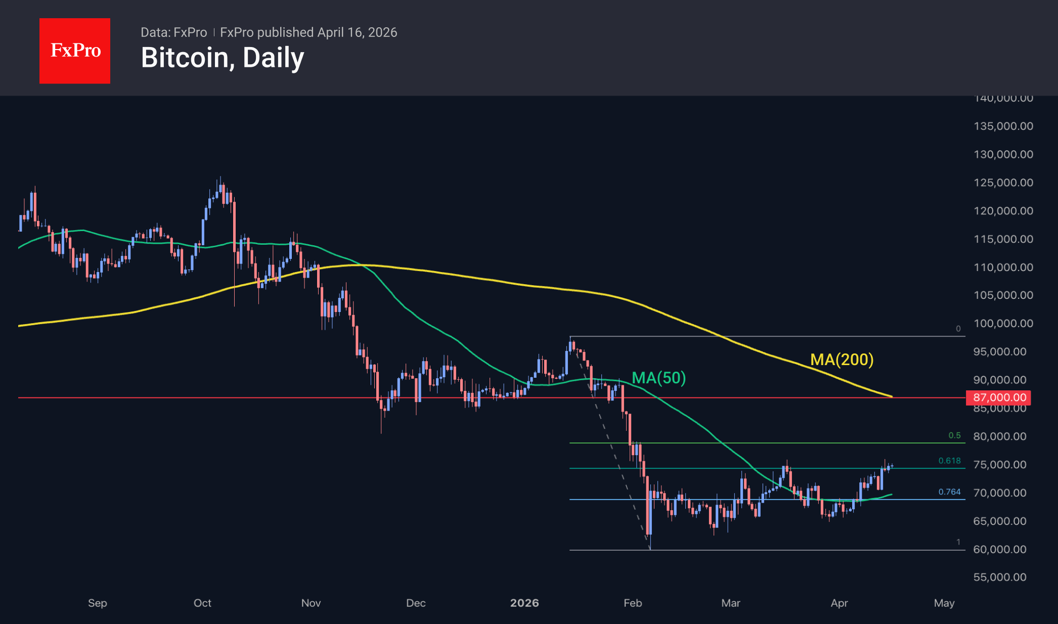 Bitcoin is trading around $75K, attempting to break free from the grip of the corrective pullback and head further upwards. Current levels are slightly below the highs of the last two months, but an upward trend is evident, with gains in 9 of the last 12 days. All this, combined with the Nasdaq100’s 16% rally from its late-March lows, increases the chances of accelerated BTC growth towards the 200-day moving average at $87K.