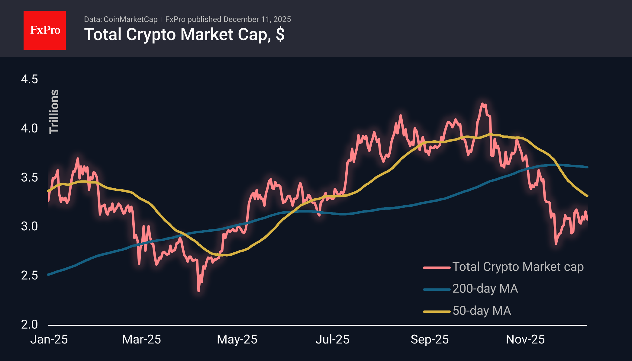 Bitcoin jumped to $94.5K on Wednesday evening in response to the Fed’s announcement of a bond-buying programme and a key rate cut. But this link to stocks played a cruel joke. The fall in Oracle shares dragged the Nasdaq-100 to eight-day lows, and BTC rolled back to $90K. The market is testing the strength of the modest uptrend that has been forming since 21 November. A drop below $88K would break this trend, bolster bearish sentiment and confirm the end of the recovery rally.