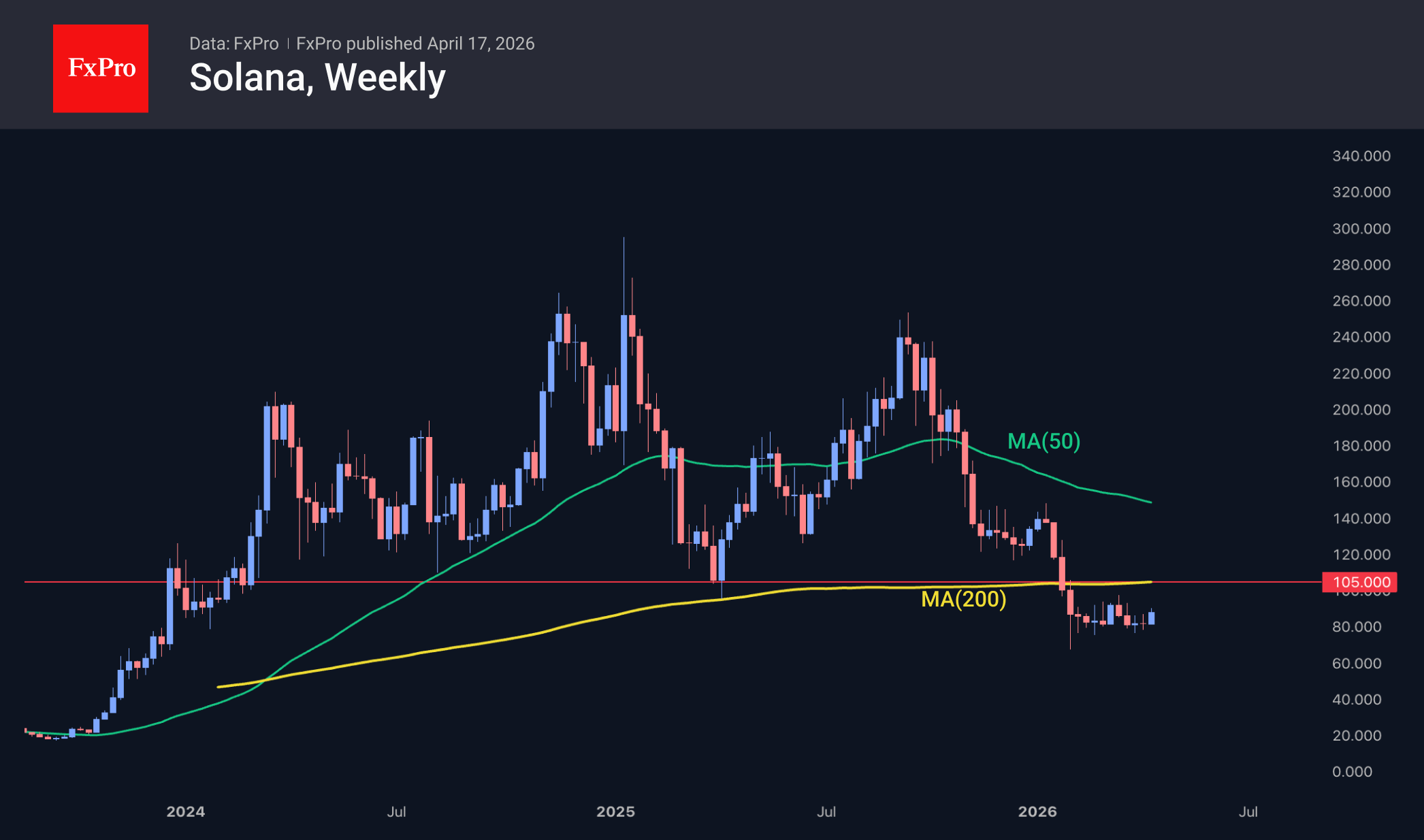 Solana has significantly outperformed the market over the last day, attempting to bounce off an important long-term support line, but failing to do so for over two months now. We will only be able to declare a victory for the bulls once it has consolidated above the $105 level, at which point we can talk about a return above the 200-week moving average, a break above previous local highs and a breach of the round figure.
