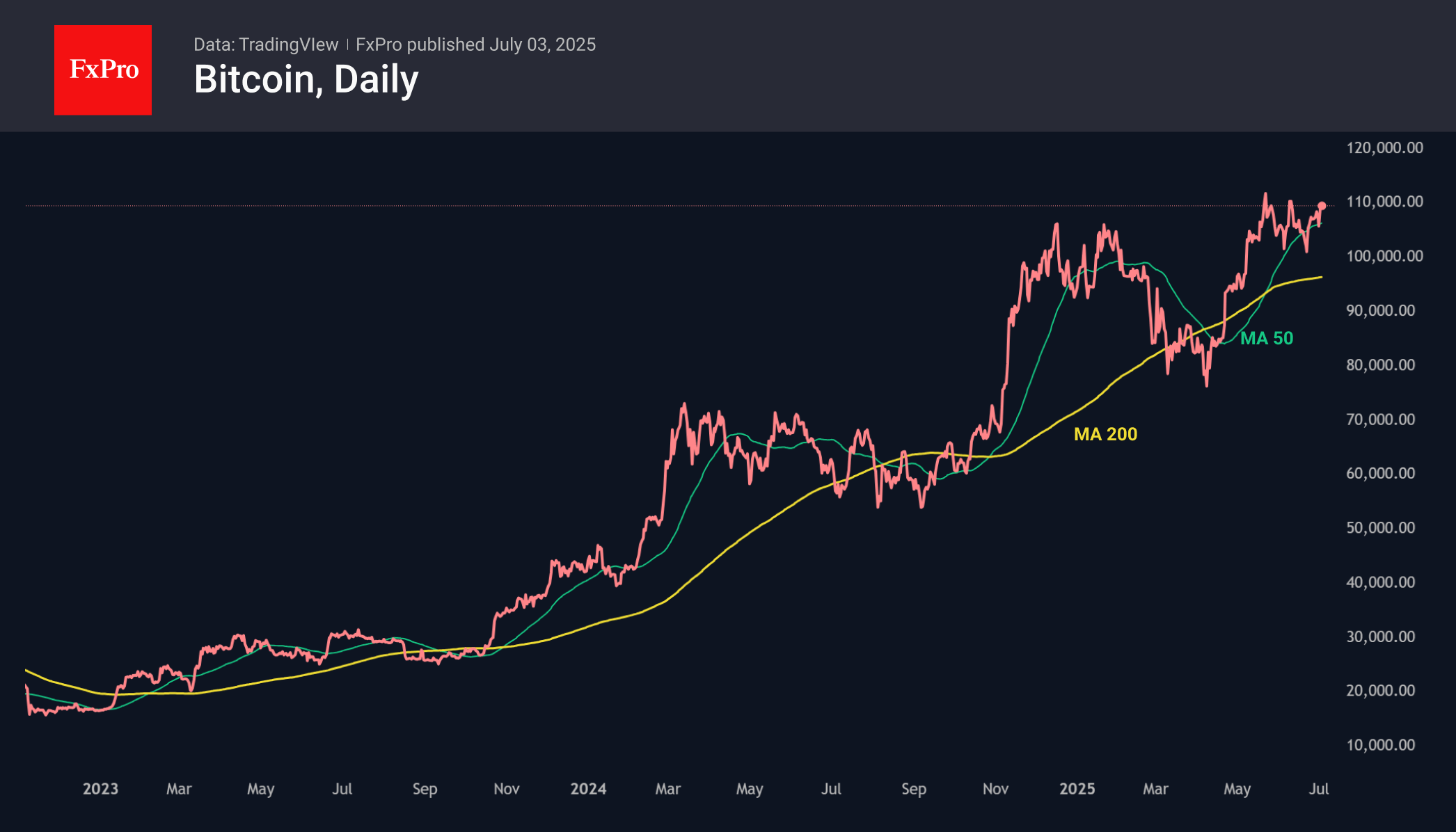 Bitcoin exceeded the $109.5K mark yesterday evening. A small corrective pullback at the start of the day on Thursday by 1,000 was quickly replaced by a return to the highs of early June. The historical high of around $112K, set at the end of May, may be tested for strength or updated before the end of this week, given the fairly high risk appetite in global markets. However, it is worth remembering that the monthly US employment report, due later Thursday, could serve as both a catalyst and an insurmountable obstacle.