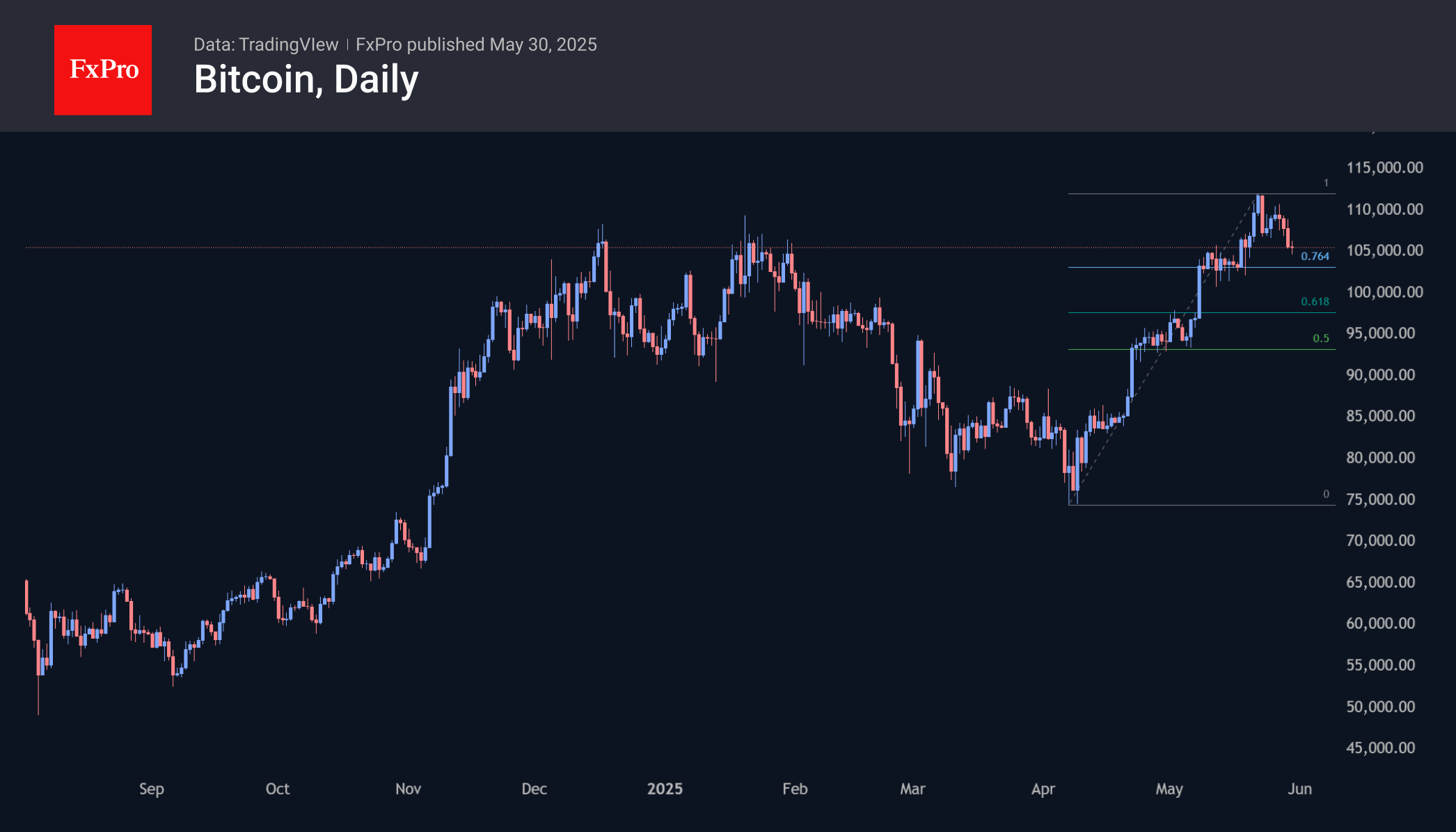 Bitcoin was down to $104.7K on Friday morning, stabilising at $106.0K by the start of active European trading, showing a fourth day of declines. Technically, a pullback down to $103K would fit into a technical correction. Even a failure to $99K would formally satisfy the Fibonacci retracement pattern. However, even 103 looks like a strong enough local support for the coming days.