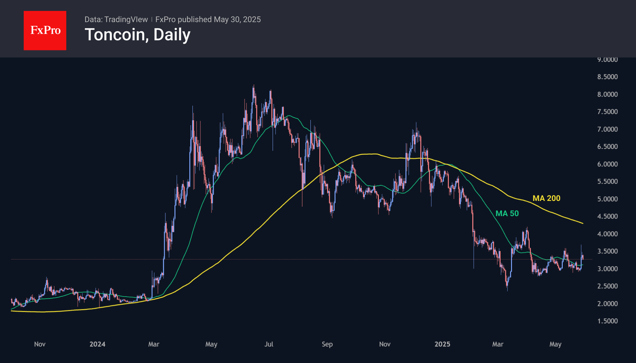 The successful Telegram bond offering allowed TON to swim against the market, adding 0.5% in one day and 5% in seven days to $3.11. The rebound from multi-month highs has no significant obstacles until $4.20, where the early April peak and the 200-day moving average combine.