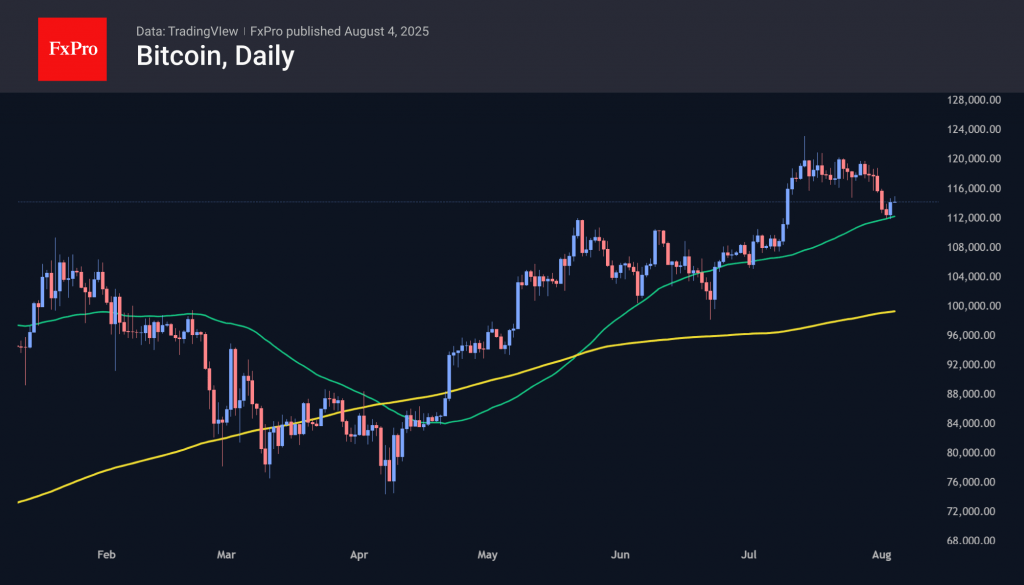 On Saturday and Sunday, Bitcoin received support from buyers on declines below $112K near the 50-day moving average – the fourth touch of this curve since April. On the “buy the dip” sentiment, the first cryptocurrency recovered to $115K on Monday morning. The rebound from support is a bullish signal for the next couple of days, but the fact that it has been tested frequently raises concerns for the medium term.