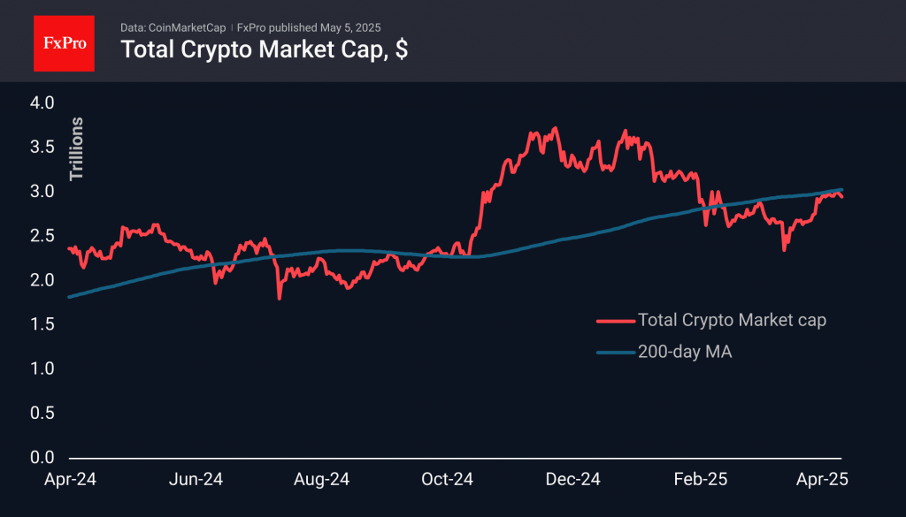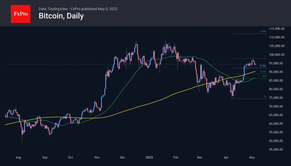Bitcoin has pulled back below $95000, correcting after briefly breaking above $98000 last Friday. The price has returned to the area of former strong support that worked from December to February. Expectedly, it is now equally strong resistance. Technical correction targets look like the $92500 and $89000 levels. However, a decline below $90000 will already make the nervous, sending the price under the psychologically important round level and the 200-day moving average.
