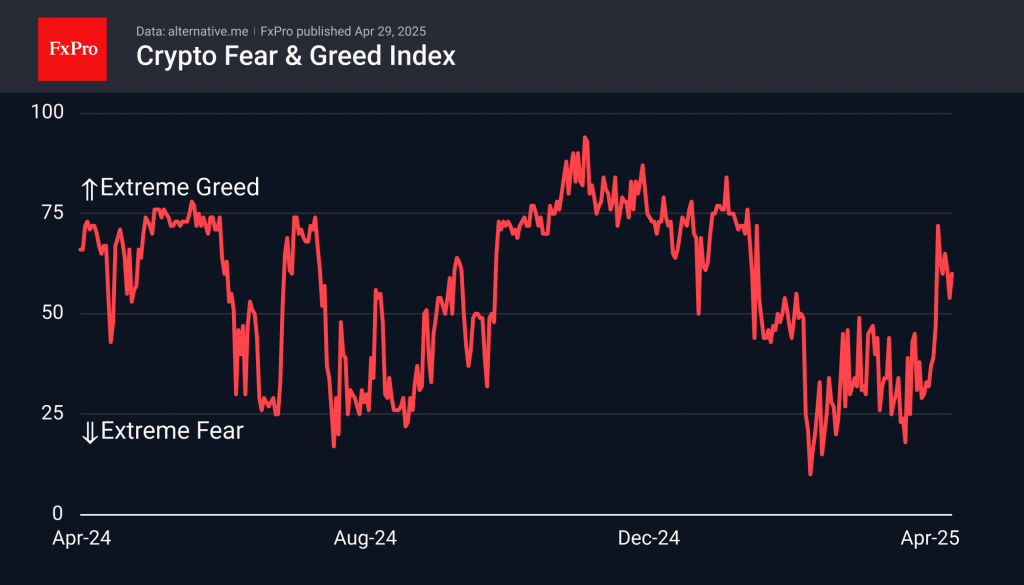 The crypto market cap has risen by 7.5% over the past seven days, stabilising just below the $3 trillion mark. This is an important consolidation of strength in front of a significant threshold in the form of the 200-day moving average. Overcoming this line will attract large active funds, which is an important benchmark. A confident return to the territory above $3 trillion can significantly increase buyer activity.