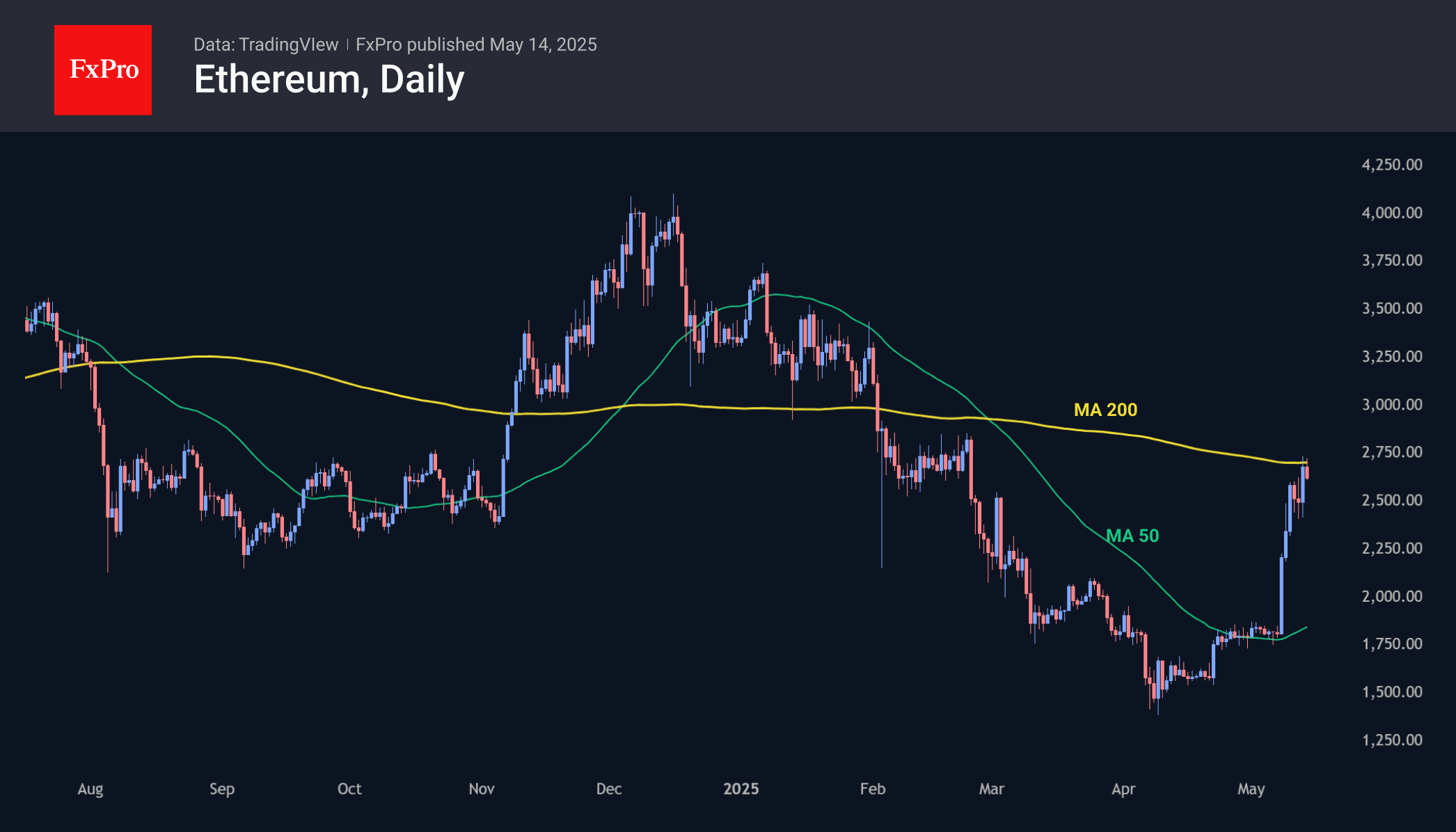 Ethereum is trading around $2615, having failed to consolidate above the $2700 mark, around which the 200-day moving average also passes. It is likely that after rallying 55% over the past seven days, the second-largest capitalised cryptocurrency will probably take a pause or start a correction with a potential target at $2400.