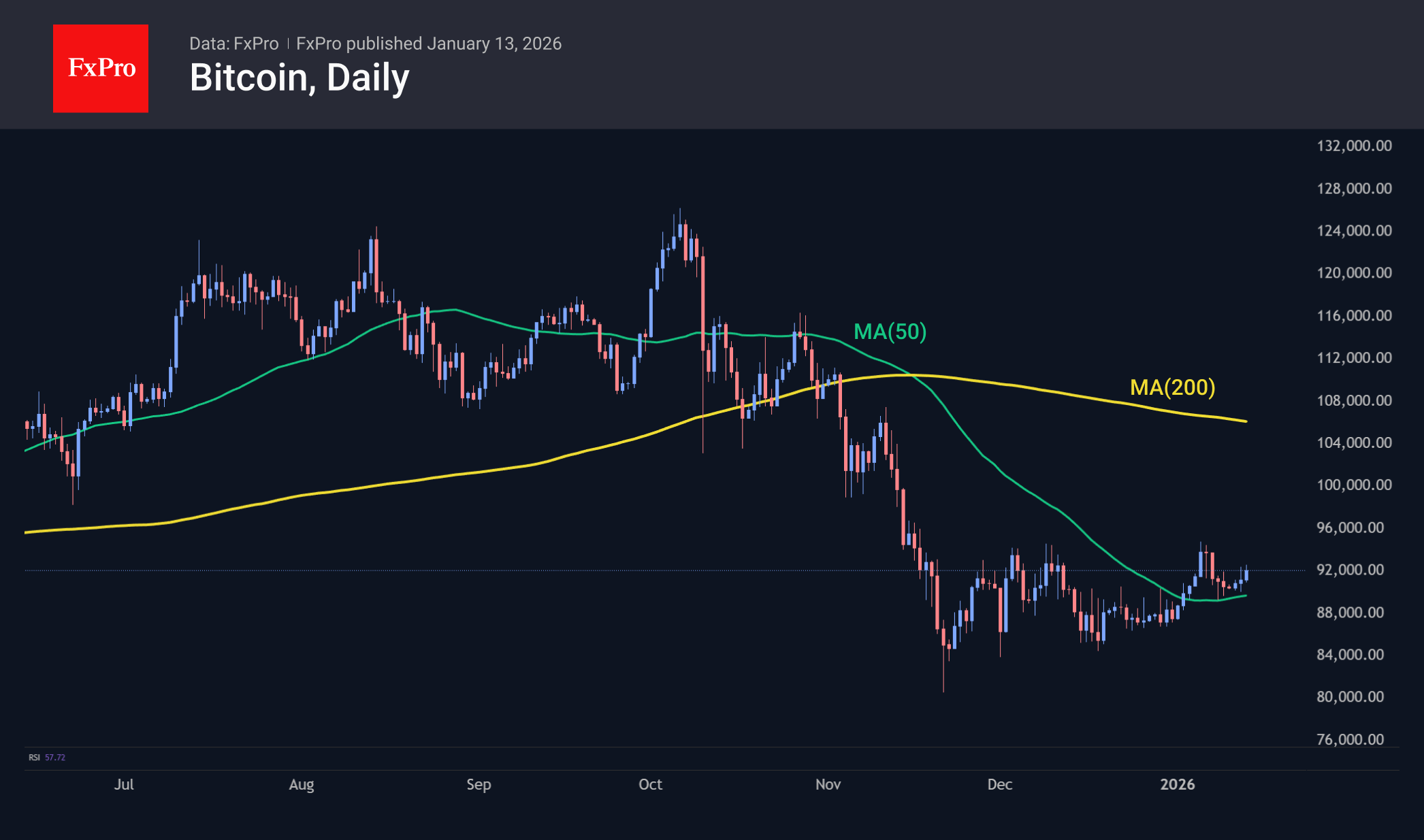 Bitcoin has exceeded $92K since Monday evening, attempting to climb above levels seen a week ago. There were wide fluctuations on Monday, with an impressive increase in sales when the price rose above $92K, but this did not deter the bulls from continuing their attempts. It would be too hasty to conclude sustained risk appetite while the price remains below previous local highs of $95K. An optimistic view of the situation considers a series of rising local lows since November.