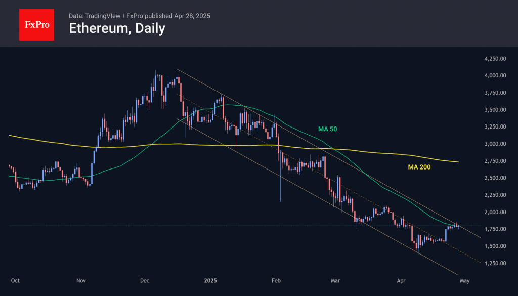 Ethereum is struggling with resistance in the form of the 50-day moving average near $1800 for the sixth day. Over the past couple of years, ETH has reacted strongly to movements around this curve: accelerating gains when breaking above it and facing significant pressure when falling below it. At the same time, there is a test of the resistance line of the descending channel, within which the movement has been going on since the second half of December.