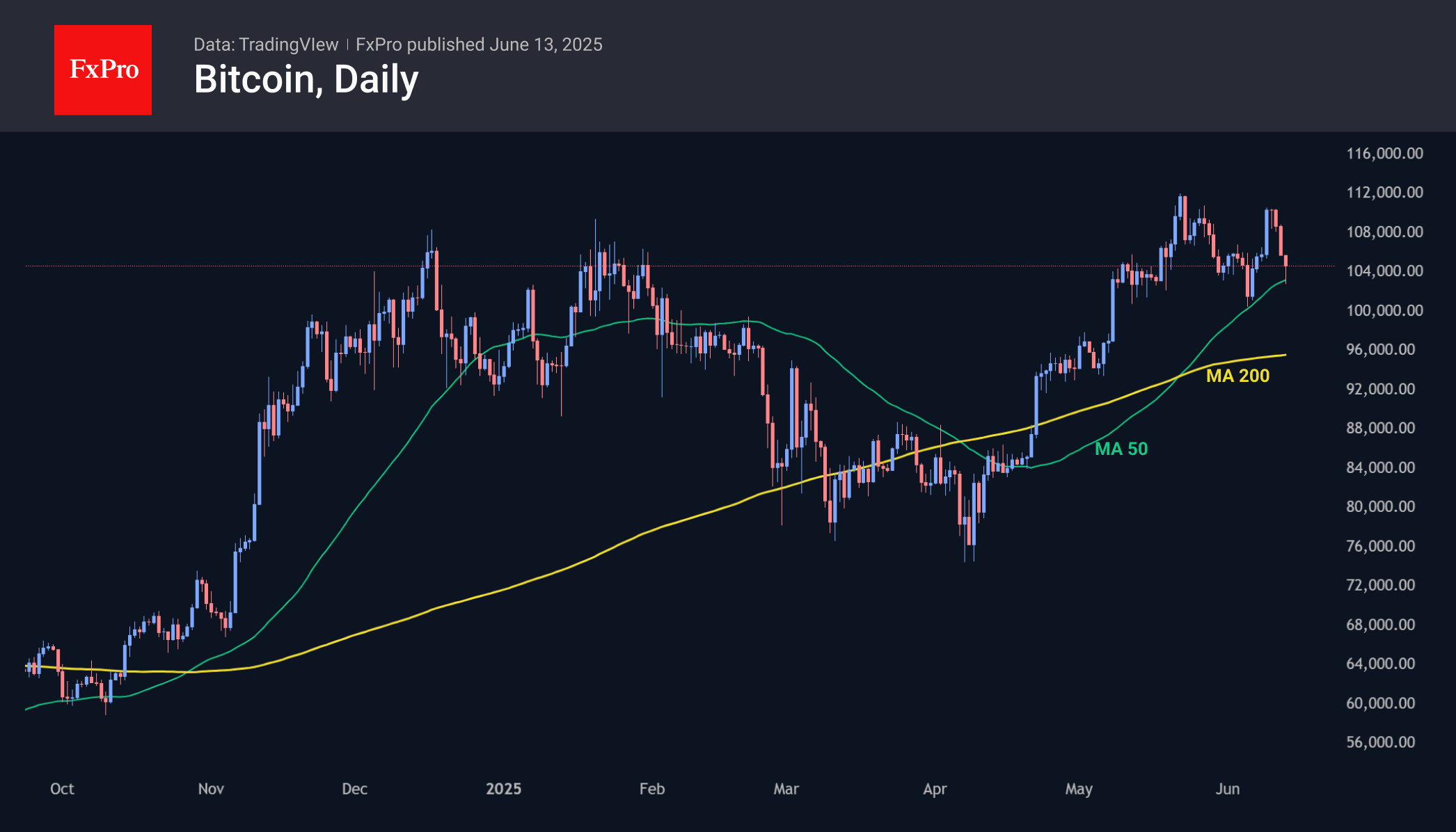 Bitcoin fell to $102.5K at the start of the day in Asia, repeating its touch of the 50-day moving average, as it did a week earlier. Although the reaction of the first cryptocurrency was sharp, the recovery to $105.0 at the time of writing indicates strong interest in buying on dips. At the same time, we do not support the idea that military conflicts are favourable for cryptocurrencies.