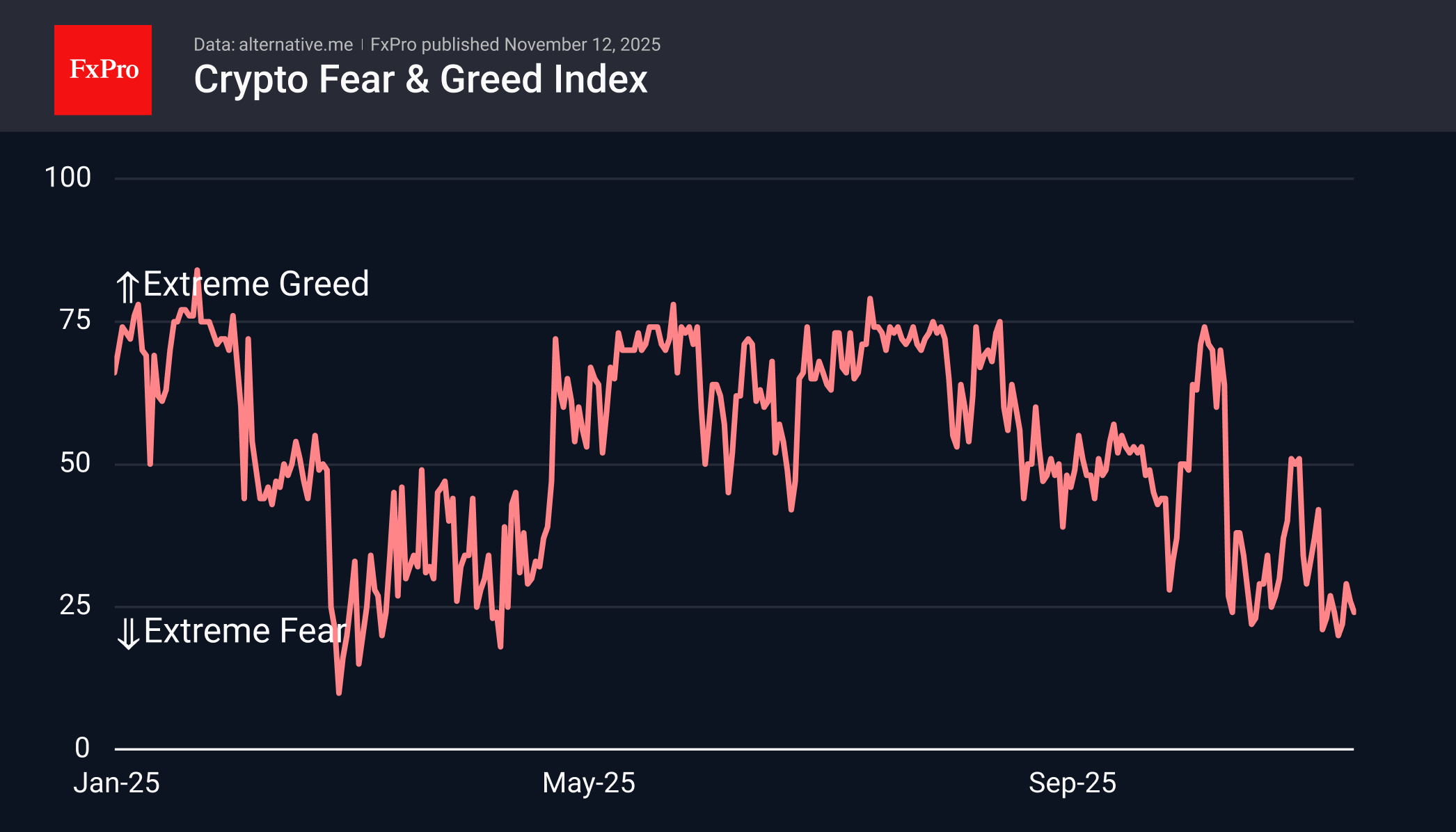 The sentiment index at 24 remains on the border between fear and extreme fear. As in the spring, it will take a long time for sentiment to reverse. Since the end of September, Bitcoin has been regaining its share of the crypto market, which was lost in July.