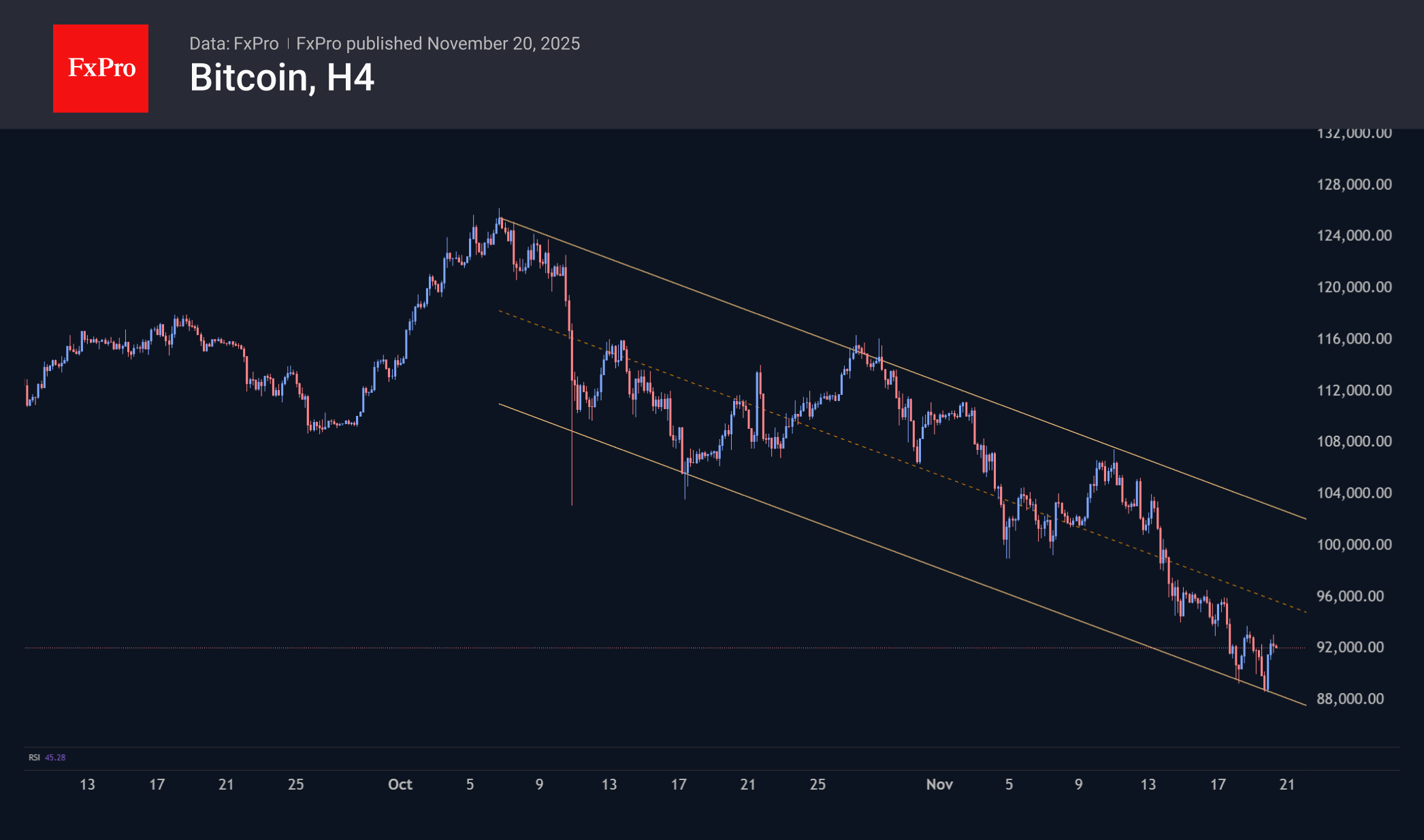 Bitcoin is trading just above $92K at the start of the day on Thursday. It has been hovering around this level for the last four days, but the last ten days have seen lower local lows (falling to $88.5K at the end of the day on Wednesday) and local highs, indicating a very aggressive sell-off. In such conditions, it is only a matter of days before the bears find stop-out levels, triggering a self-sustaining avalanche of selloffs.