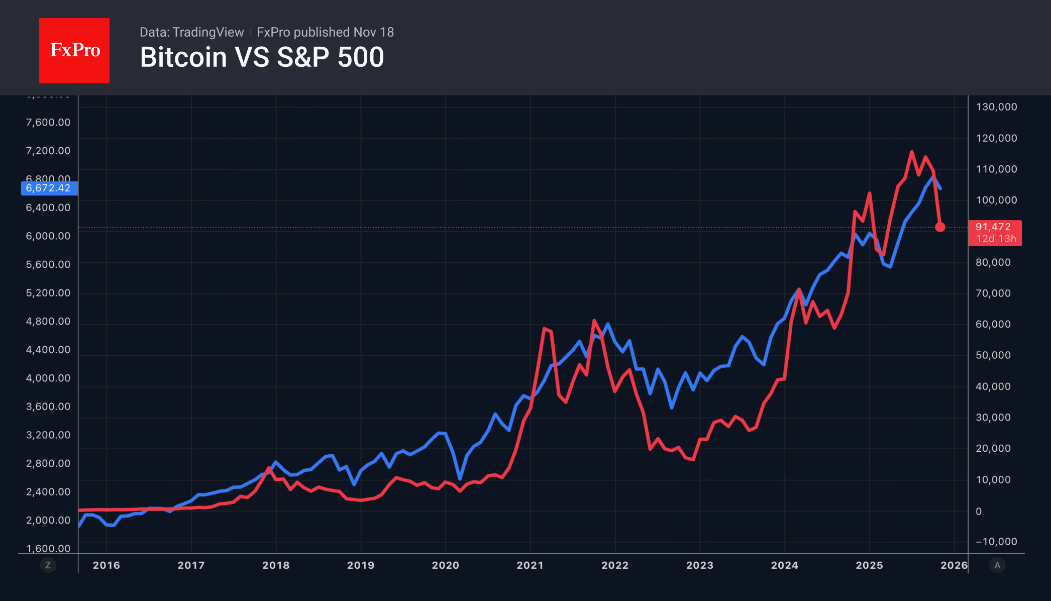 The fall in US stock indices is also due to concerns about a tech bubble. Their fundamental valuations have long been considered overpriced. However, investors turned a blind eye to this, hoping for a softening of policy. Disappointment has led to a sell-off of riskier assets and Bitcoin has not been spared.
