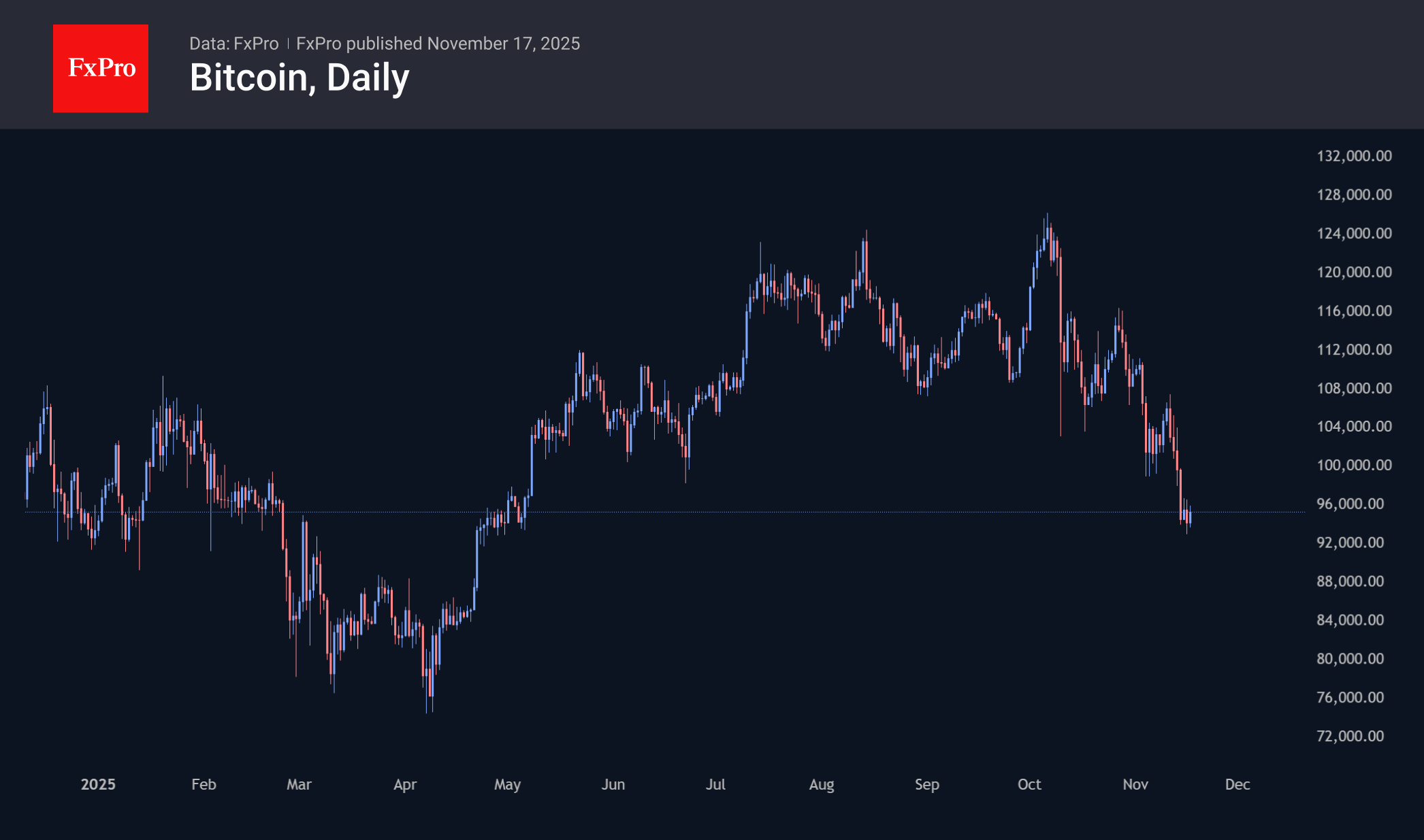 The crypto market cap has lost 9.5% over the past seven days. The decline took place on weekdays last week, with the level stabilising around $3.25 trillion over the weekend. Among altcoins, the standout is the unsinkable Zcash at $700, nearing its highs, and weak Solana and Ethereum, which have lost 45% and 40% from their August and September highs, respectively.