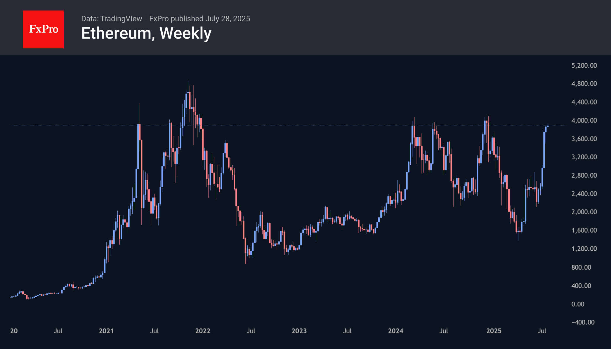 Ethereum rose to $3925, reaching last year’s highs. The main altcoin made three big attempts to break through $4000, but these were followed by declines of a third, almost half and two-thirds. Although this background sounds daunting, it shows a strong history of perseverance. It is quite likely that this time the resistance will be broken. It would be a surprise if we see a rapid rise to the historical highs of $5,000 set at the end of 2021.
