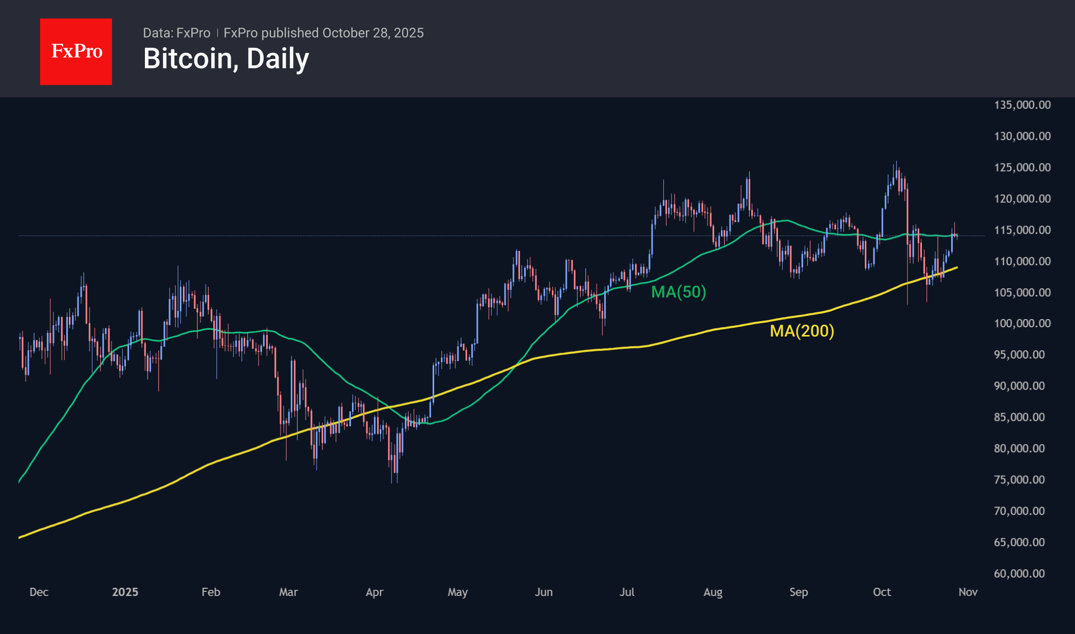 Bitcoin has fallen back to $114K, remaining stuck to the 50-day moving average. At the start of the week, there was an attempt to break out of the range defined by the 50- and 200-day moving averages. The price pullback at the end of Monday does not allow us to declare victory for the bulls. If Bitcoin is still digital gold, this is bad news for buyers.