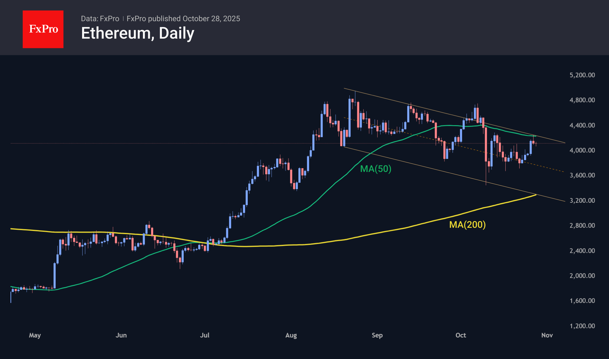 Ethereum is trading near $4,100. Attempts to break above $4,200 and overcome resistance in the form of the 50-day average on Monday were unsuccessful. Since August, ETHUSD has been on a downward trend with lower local lows and highs. We can only discuss a break in this trend after it consolidates above $4,300.
