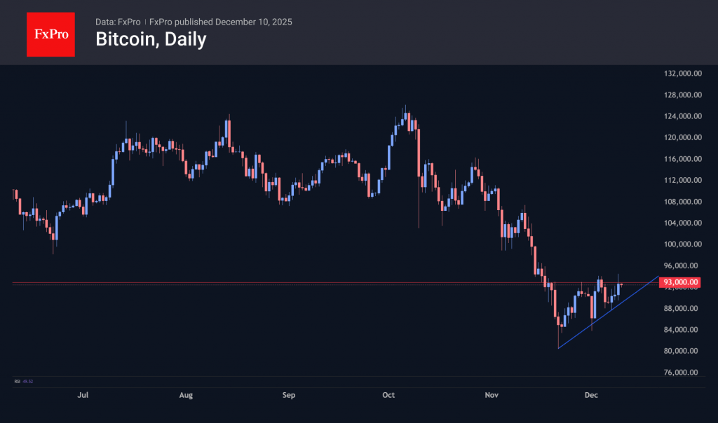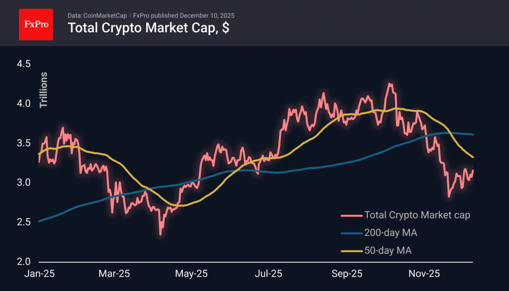 The crypto market cap increased by 2.5% to $3.16T following Bitcoin’s surge, surpassing the previous local maximum of over $3.21T. Strictly speaking, we have observed a series of higher local highs and lows since 21 November. Moreover, the market is moving beyond the medium-term downward range that has dominated since early October. However, to definitively classify the rebound as the start of capitalisation growth, it needs to surpass $3.32T, which is 6% above current levels.