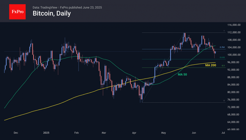 Bitcoin slipped to $98K over the weekend. This was a touch of the classic support at 61.8% of the April-May rally, but at the start of the European trading session, it was already close to $102K, compared to $102.7K at the start of the day on Sunday. However, last week’s sell-off broke the support at the 50-day moving average under the weight of external circumstances. Breaking out of the $96–105K range will force us to wait for further movement in the direction of the breakout.