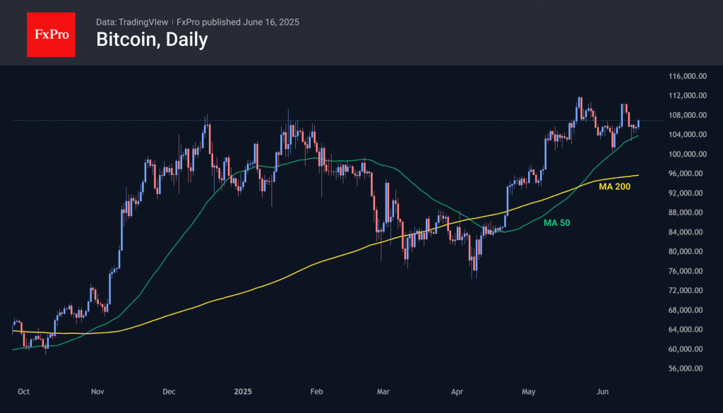 Bitcoin is up 1.7%, lagging major altcoins such as Solana (+7.8%) and Ethereum (+4.1%) in terms of growth. After finding support on the decline in the $104K area, near which the 50-day moving average also passes, BTC confirmed its commitment to the upward trend. However, resistance at $110K proved too difficult for the bulls in May and early June. Will they manage to consolidate above the current momentum? We will find out this week.