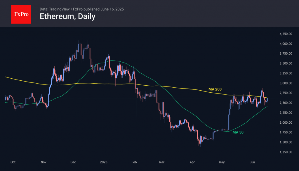 Ethereum has gained 5% since the start of the day on Monday to $2,630, having been trying to break through the 200-day average for over a month. The best attempt during this time was last week, with an update of 4-month highs on 11 June. Over the weekend, we again saw active support on declines below $2,500. Paradoxically, the positive market sentiment is working in favour of bulls in cryptocurrencies.