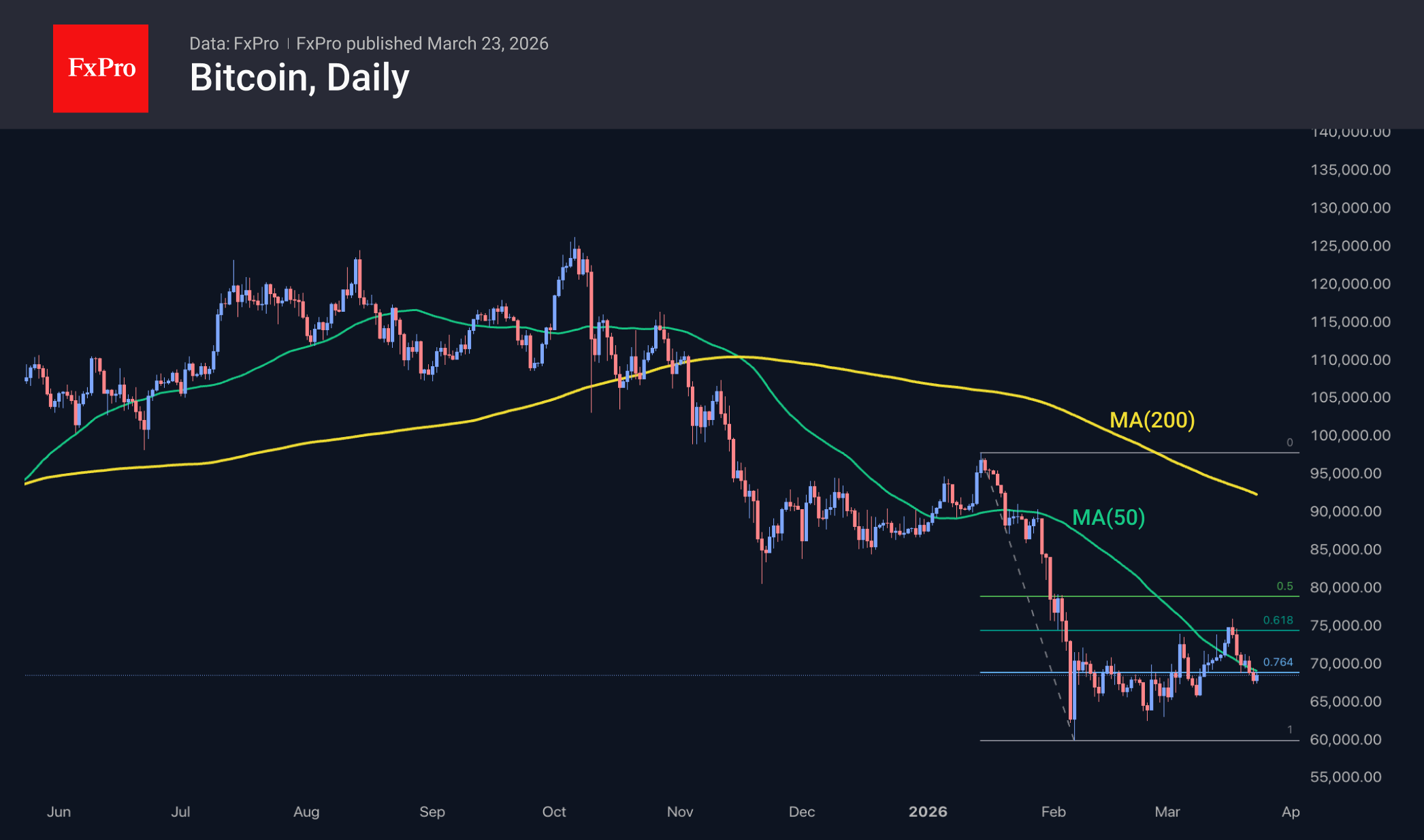 Bitcoin is nearing $71K, having increased nearly 5% since Monday morning. Geopolitical news has been a strong influence, dispelling the gloom of recent days. Although BTC was at these levels not long ago, from a technical analysis standpoint, this marks a notable shift. This time, we are witnessing powerful upward momentum from the key 50-day moving average. A sustained move above it would indicate a trend reversal, supporting the shift in market reaction to news and the dynamics of the sentiment index. It would also signal a return to normality after a prolonged period of oversold conditions. However, cautious traders will likely prefer to wait for the price to stabilise above $75K—the recent peak and an important Fibonacci retracement level.