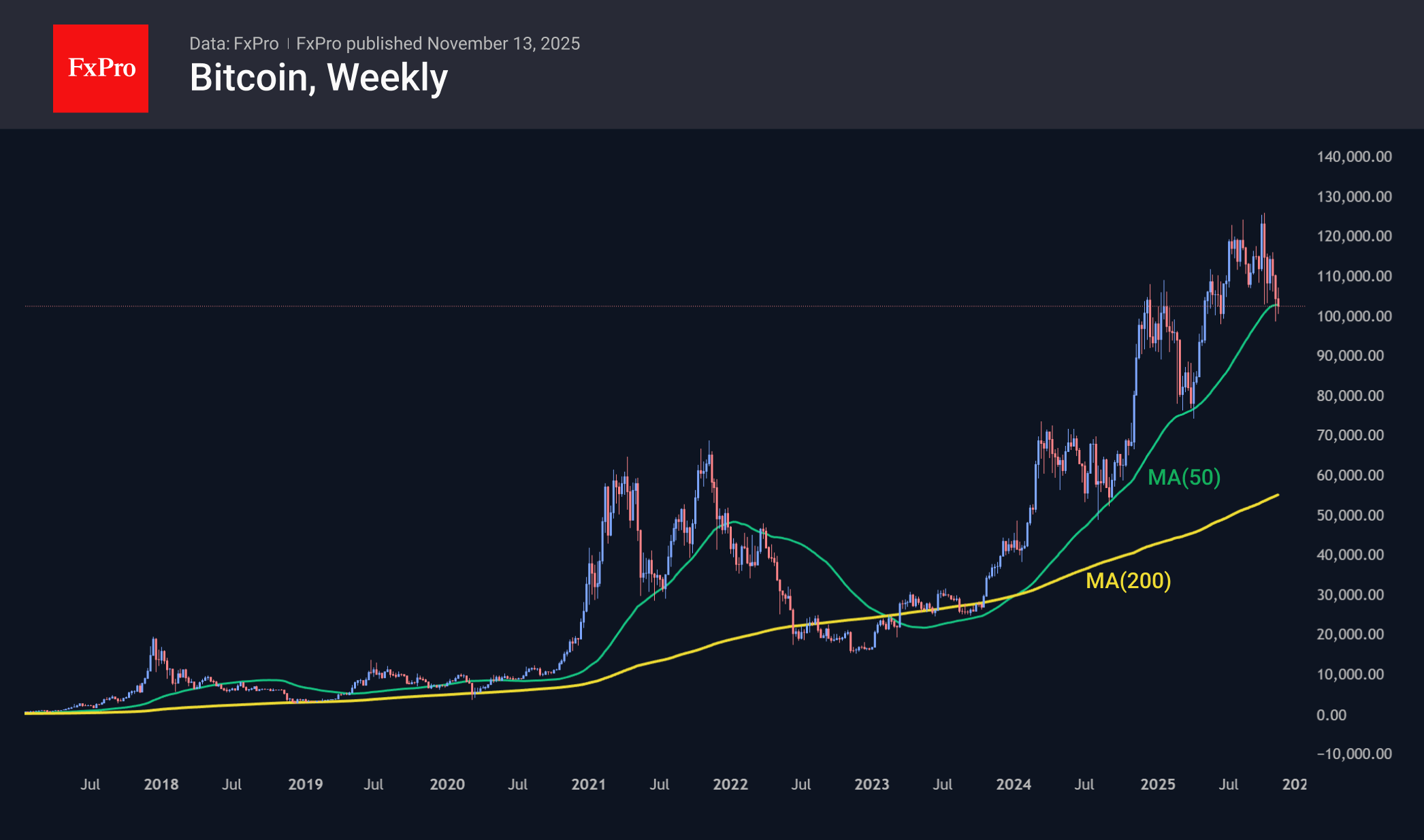 Bitcoin continues to struggle to remain within the bull market on weekly timeframes, trying to stay above the 50-week moving average. Last week’s close was on the edge, and attempts to develop an offensive this week are running into selloffs, despite the favourable external backdrop. The previous such transition occurred at the end of 2021, and so far, everything aligns with the 4-year halving cycles that many were quick to dismiss.