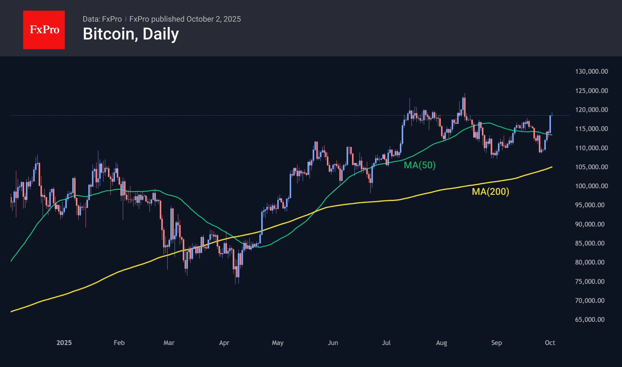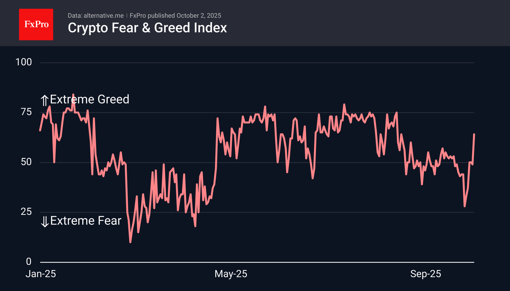 The cryptocurrency market capitalisation soared by 4% over the past day to $4.07 trillion. The capitalisation has soared into the extreme zone, above which it was only briefly in mid-August and mid-September. Cryptocurrency investors are convinced that the US government shutdown is not dampening risk appetite, and macroeconomic data is pushing the Fed to ease its policy further.