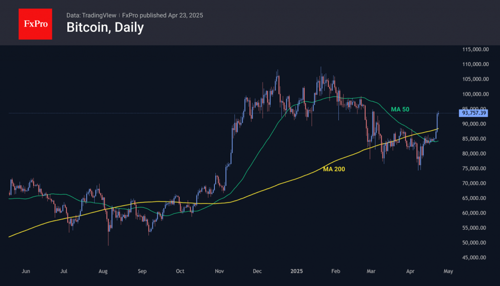 Bitcoin is nearing the $94,000 mark, which it briefly surpassed in early March. Sustained trading above this level was last observed in late February, before the most recent sell-off began. The market has signalled a clear bullish trend, initiating a sharp rise from the 50-day moving average and breaking through the 200-day with determination. In recent days, the price has also exceeded the downward resistance that had been in place since late January. The next target seems to be the $96,000 region, but the broader picture suggests a rally gaining momentum with the potential to challenge all-time highs near $110,000.