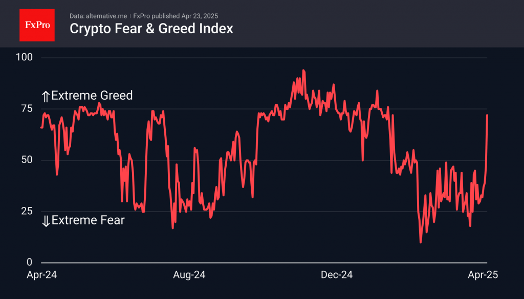Sentiment in the cryptocurrency space has swiftly shifted towards greed and is now steps away from extreme greed, with the relevant index climbing to 72, the highest since late January.
