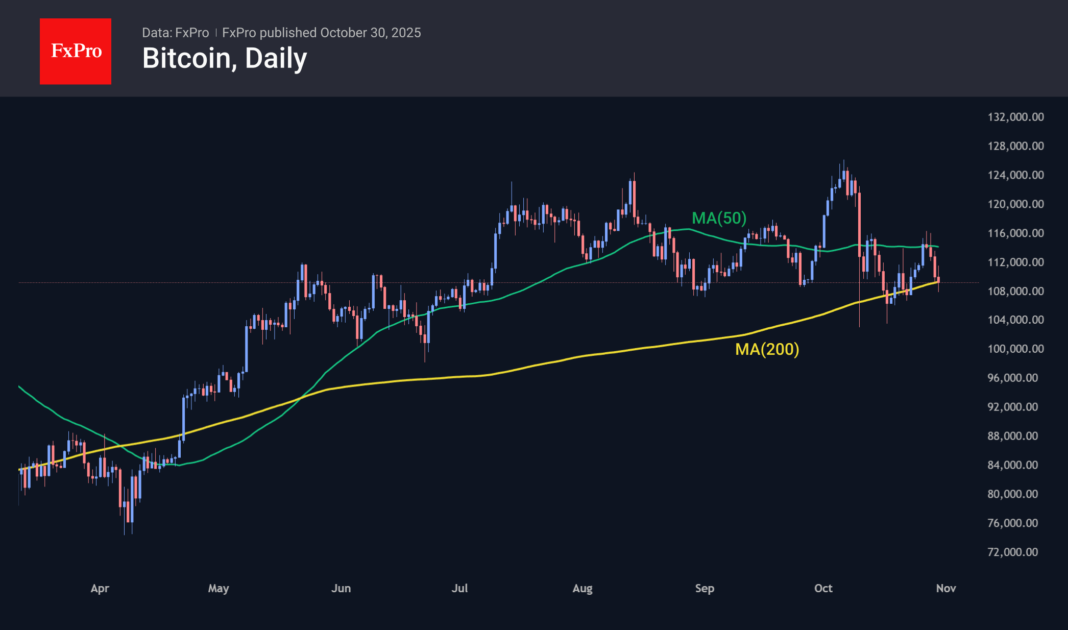Bitcoin volatility has increased since the end of Wednesday due to the reaction to the FOMC comments. The Fed reassured the markets that a rate cut in December is not a foregone conclusion. As a result, the first cryptocurrency is once again hoping for strong support at the 200-day average. In October, the 11th daily candle is touching this line.