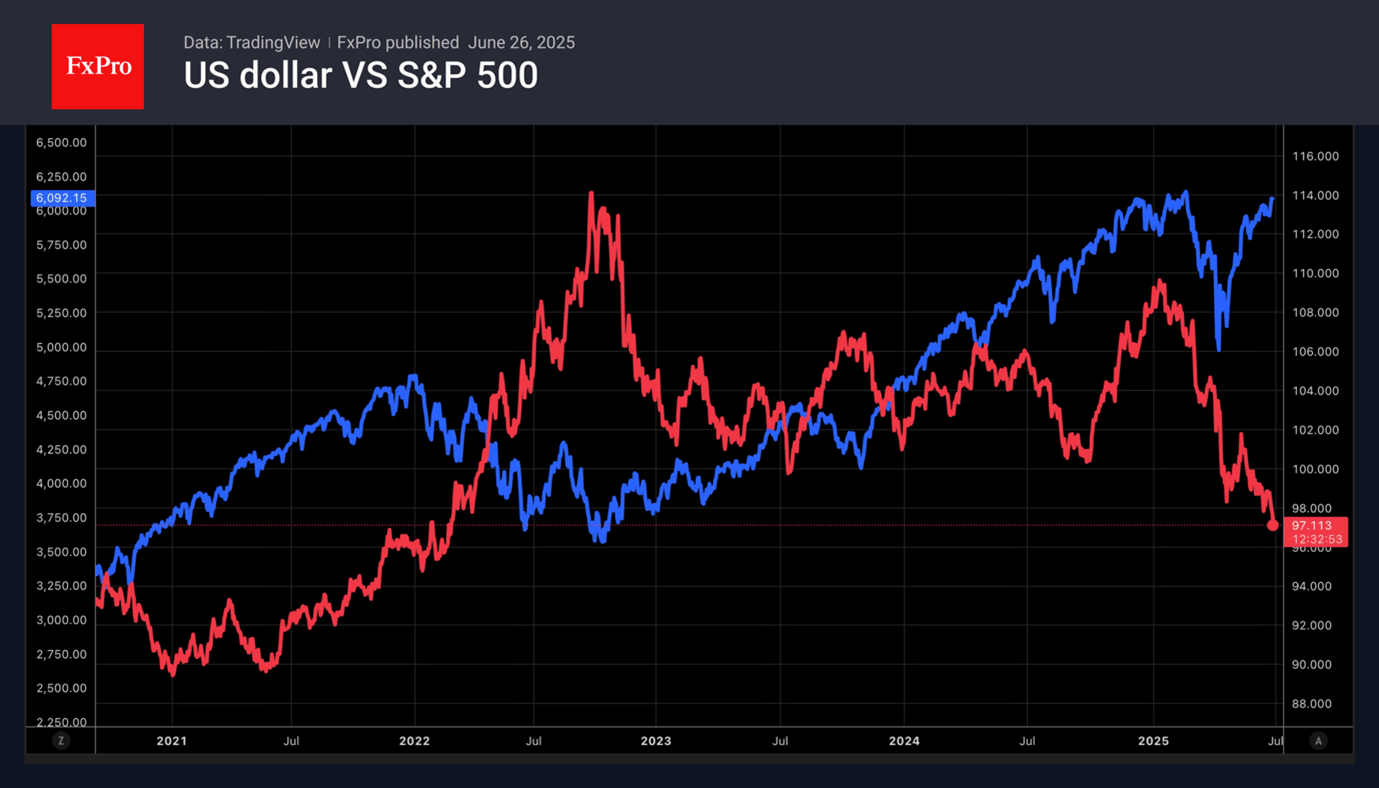 This year risks being the worst for the US dollar since 2017. Since the beginning of 2025, the DXY has lost about 9.5% and is likely to continue falling due to divergences in monetary policy. Major central banks are holding.