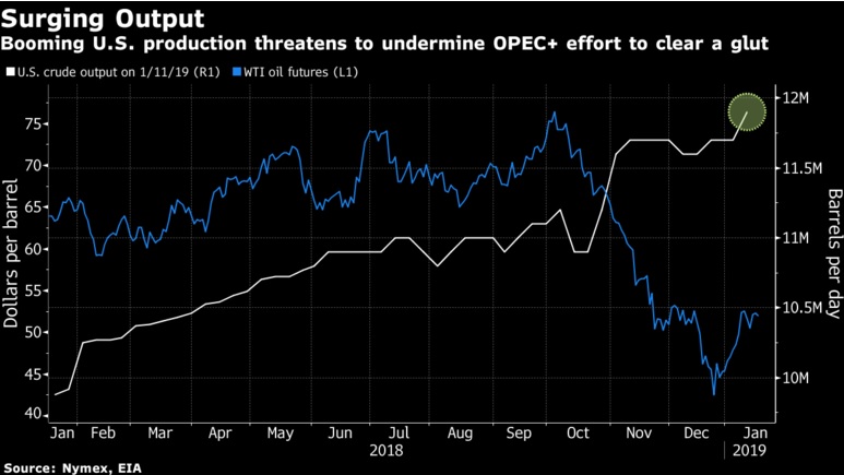 In America, crude production rose 200,000 barrels last week to 11.9 million barrels a day, the highest level in weekly figures since 1983 compiled by the Energy Information Administration. In Saudi Arabia, the kingdom has slashed its crude shipments to refiners in the U.S. by 32 percent to 684,000 barrels a day for the week that ended on Jan. 11, after exporting more than 1 million barrels a day in the previous week, according to the preliminary data from the EIA. Russia’s Deputy Energy Minister Pavel Sorokin also reaffirmed the country’s willingness to cooperate with the rest of the OPEC+ coalition.