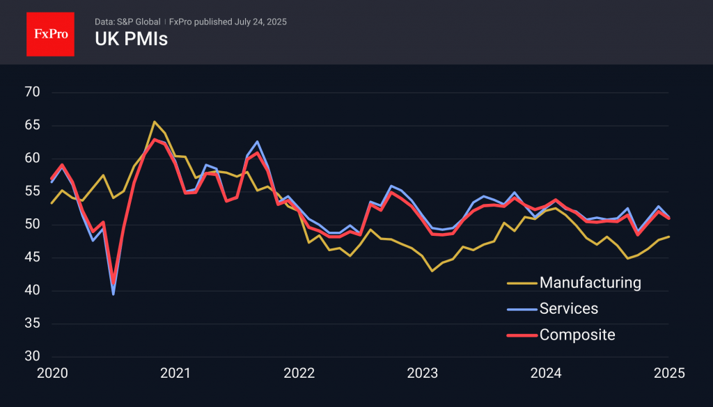 The services PMI fell to 51.2, showing a slowdown after June’s reading of 52.8.