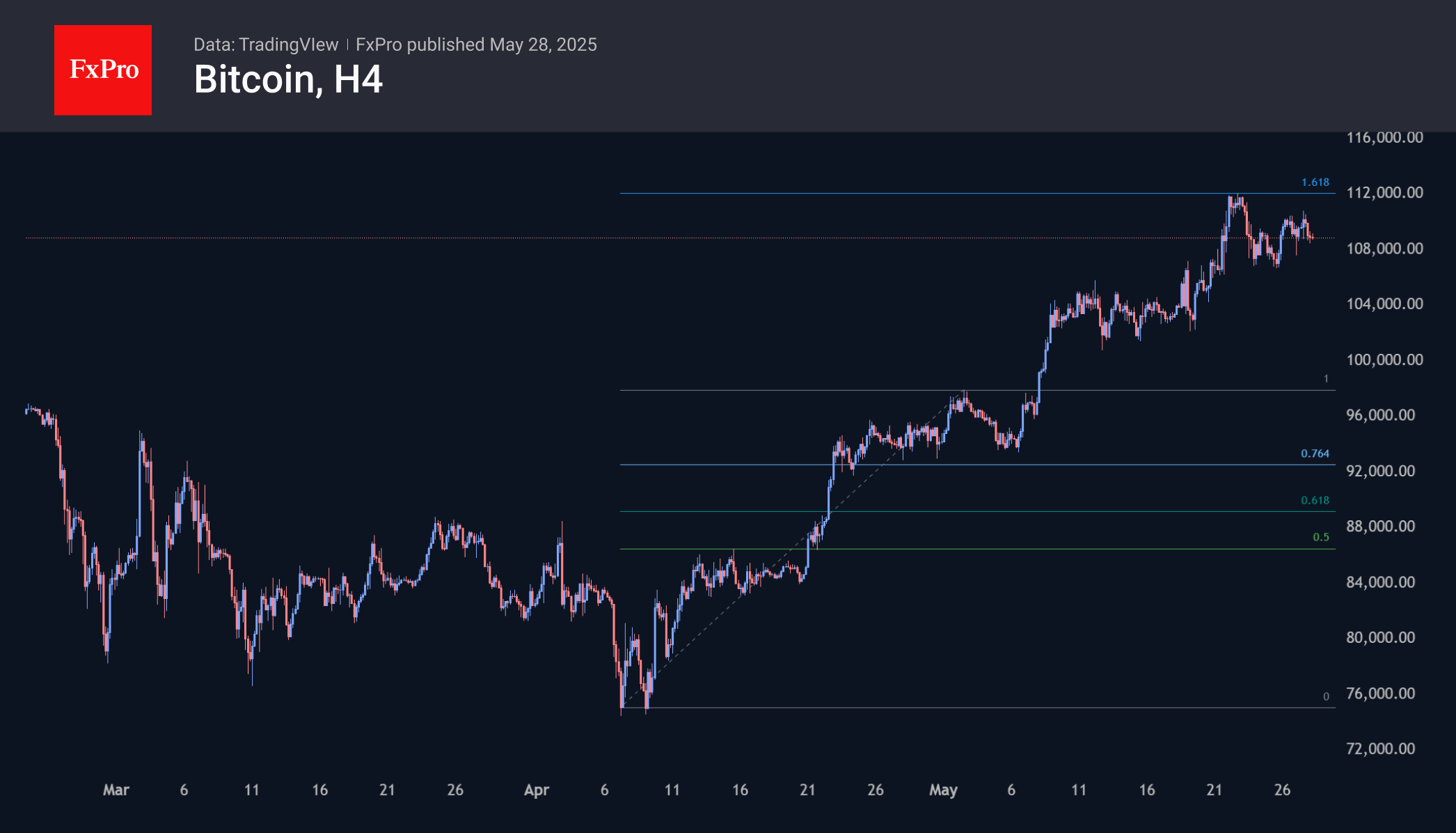 Bitcoin has been trading in a 5% range between $106.6k and $111.7k since 22 May and is currently in the middle. The current high area fits into a Fibonacci extension pattern at 161.8% of the first upside momentum from early April to the first days of May. Overcoming 112k would then be a prologue to 134k (261.8%).