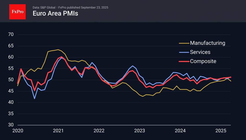 The main positive surprise came from the German services sector, where the index jumped from 49.3 to 52.8 against the expected 49.5. This is the highest the index has been since May 2024. These figures signal a return to service growth, while market participants had expected the downturn to continue, with values below 50.