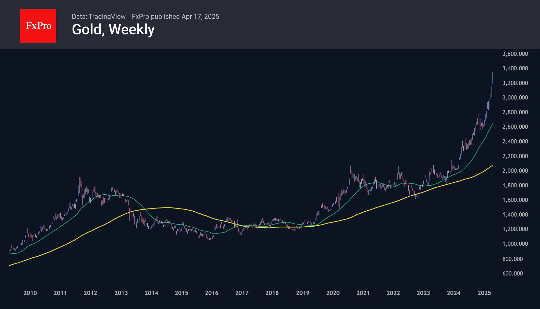 Gold delved deeper into the territory of all-time highs during the week, reaching a local top above $3350 per troy ounce on the spot market, representing a more than 4% gain from the start of the week. The price later retreated to the $3300 area.