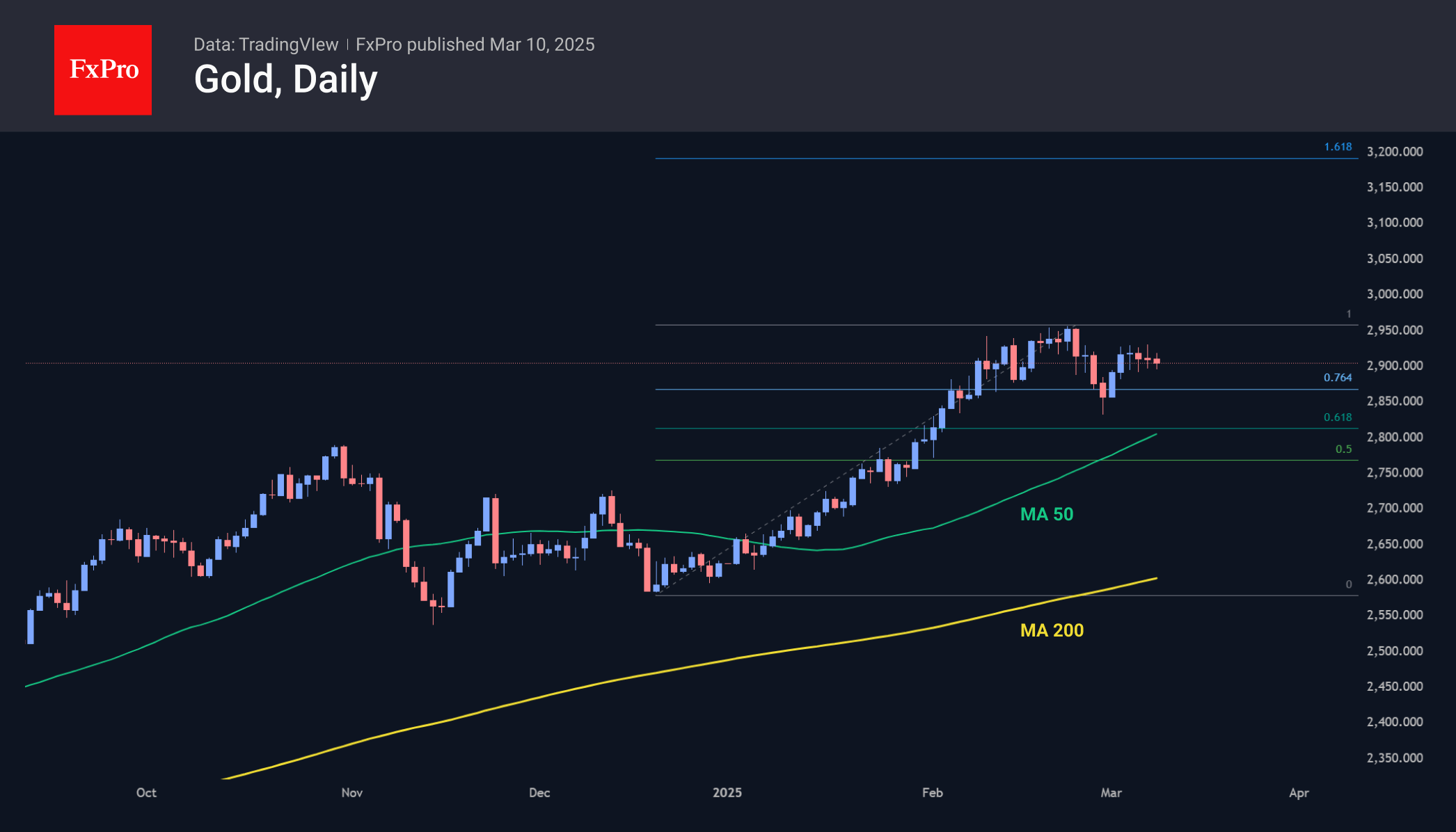 Since early March, the gold price has reversed to the upside, regularly exceeding the $2900 mark during the week. The cautious trading tone of the US indices works on the side of the bears, while the weakness of the dollar infuses confidence in the bulls.
