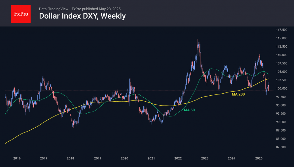 Trouble is piling up for the US. After trade wars, fiscal issues are now weighing on the dollar. Moody’s became the latest major agency to strip the US of its highest credit rating. Lawmakers passed a controversial, sweeping tax cut bill by a slim margin. A weak auction of 20-year Treasury bonds gave rise to concerns about cooling demand for treasuries from foreign investors. Finally, threats to raise tariffs on imported iPhones to 25% and on EU goods to 50%, brought back the relevance of the early April trade with simultaneous declines in stocks, bonds and the dollar.
