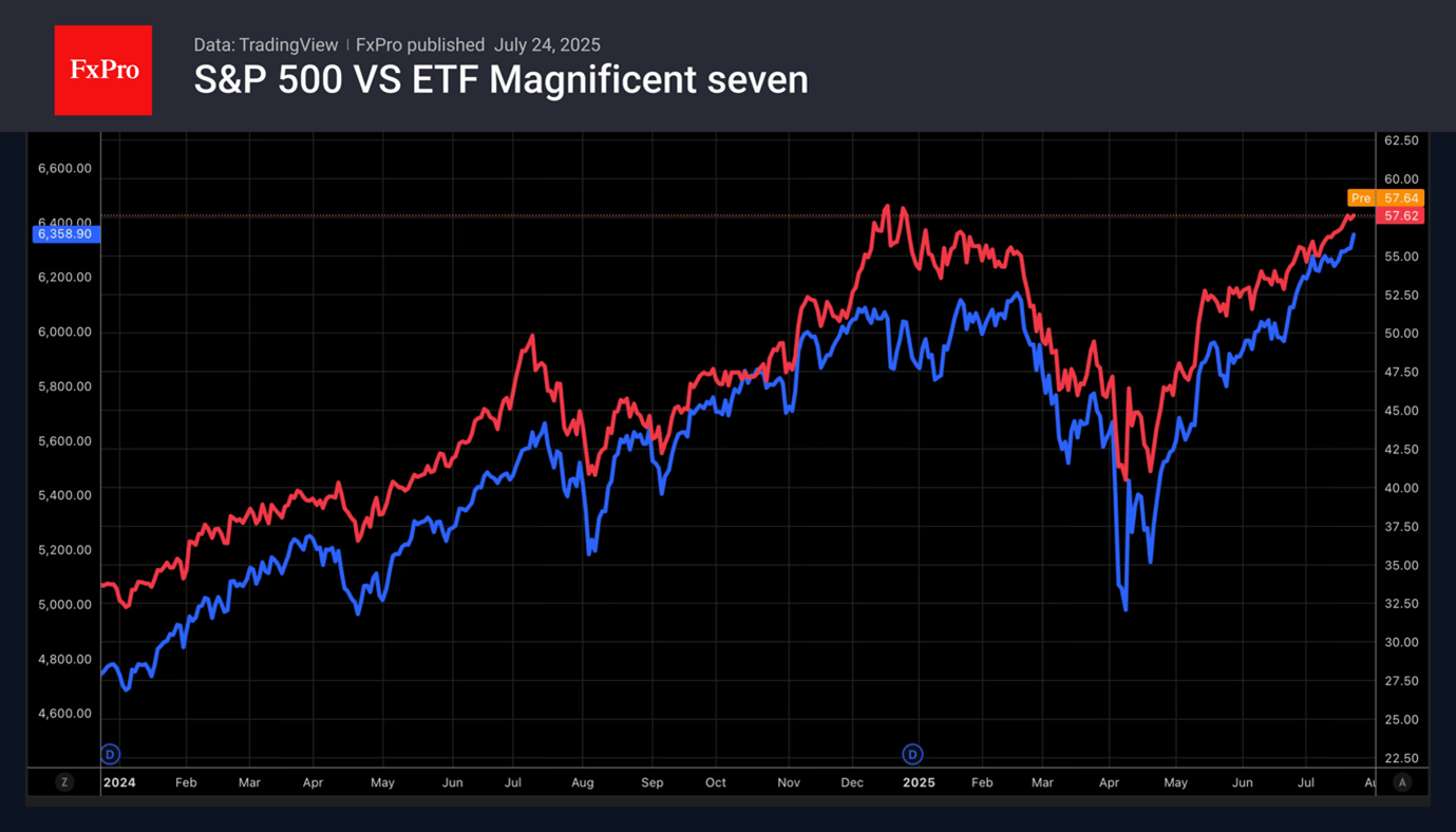 The US economy is not falling off a cliff since trade deals are reducing uncertainty. The Fed is moving towards easing monetary policy, and corporate earnings are positive. What else do stock indices need for a rally? The S&P 500 continues to break historical highs and eagerly awaits data from the so-called Magnificent Seven. Analysts expect those companies to report 14% profit growth compared to just 3% growth for the other 493 companies in the broad stock index.