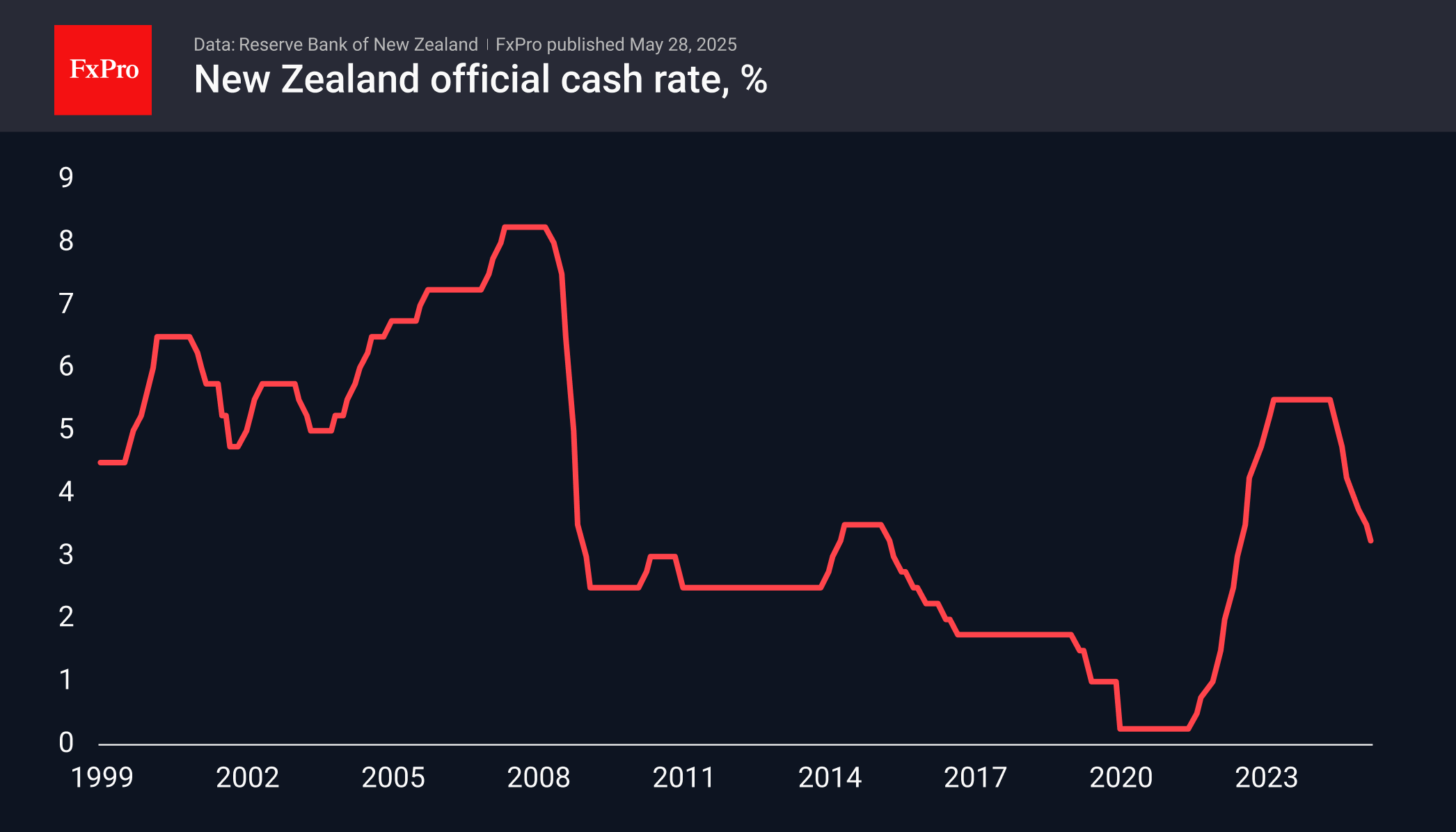As expected, the Reserve Bank of New Zealand cut its key rate by 25 basis points to 3.25%. This cycle was the sixth easing since August last year, totalling 125 b. p.