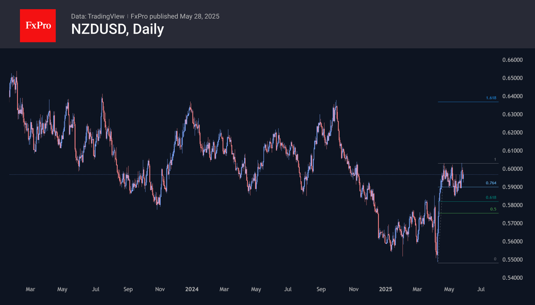 The decline within this month looks like a temporary correction after a 10% rally off the April lows. A move above 0.6000 would give a range entry with resistance at 0.6360, which has remained impregnable since early 2023.