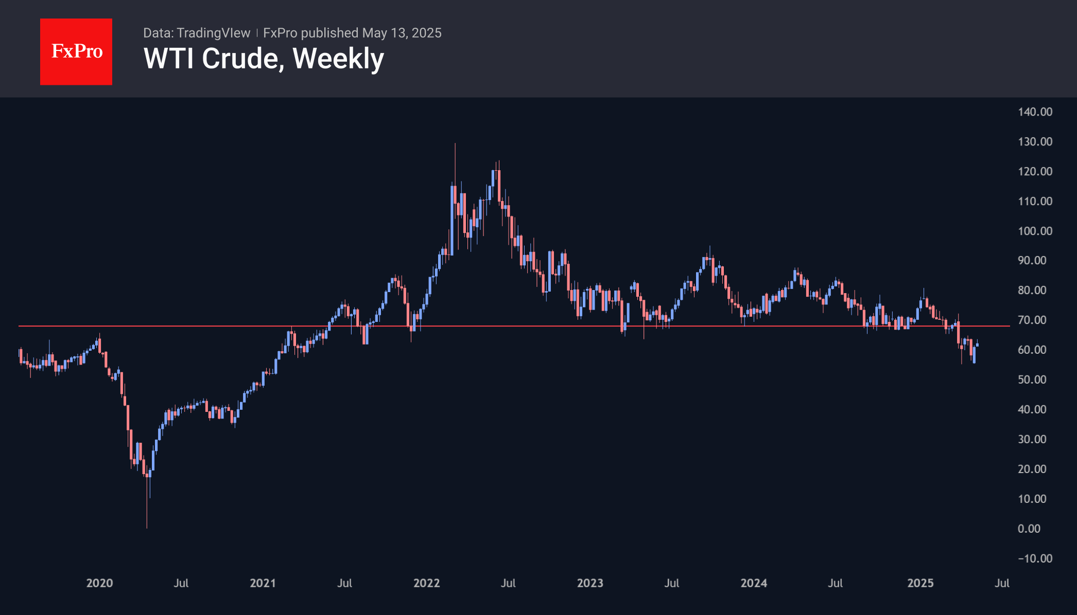 Oil prices have been rising since the start of last week, up more than 12%. The growth comes on the back of positive news on China-US tariff negotiations. The decrease in geopolitical tensions in Russia-Ukraine and India-Pakistan relations in recent days has not had a significant impact on quotations. This may be due to a lack of confidence in progress in these areas or the concentration of market participants on positive news.