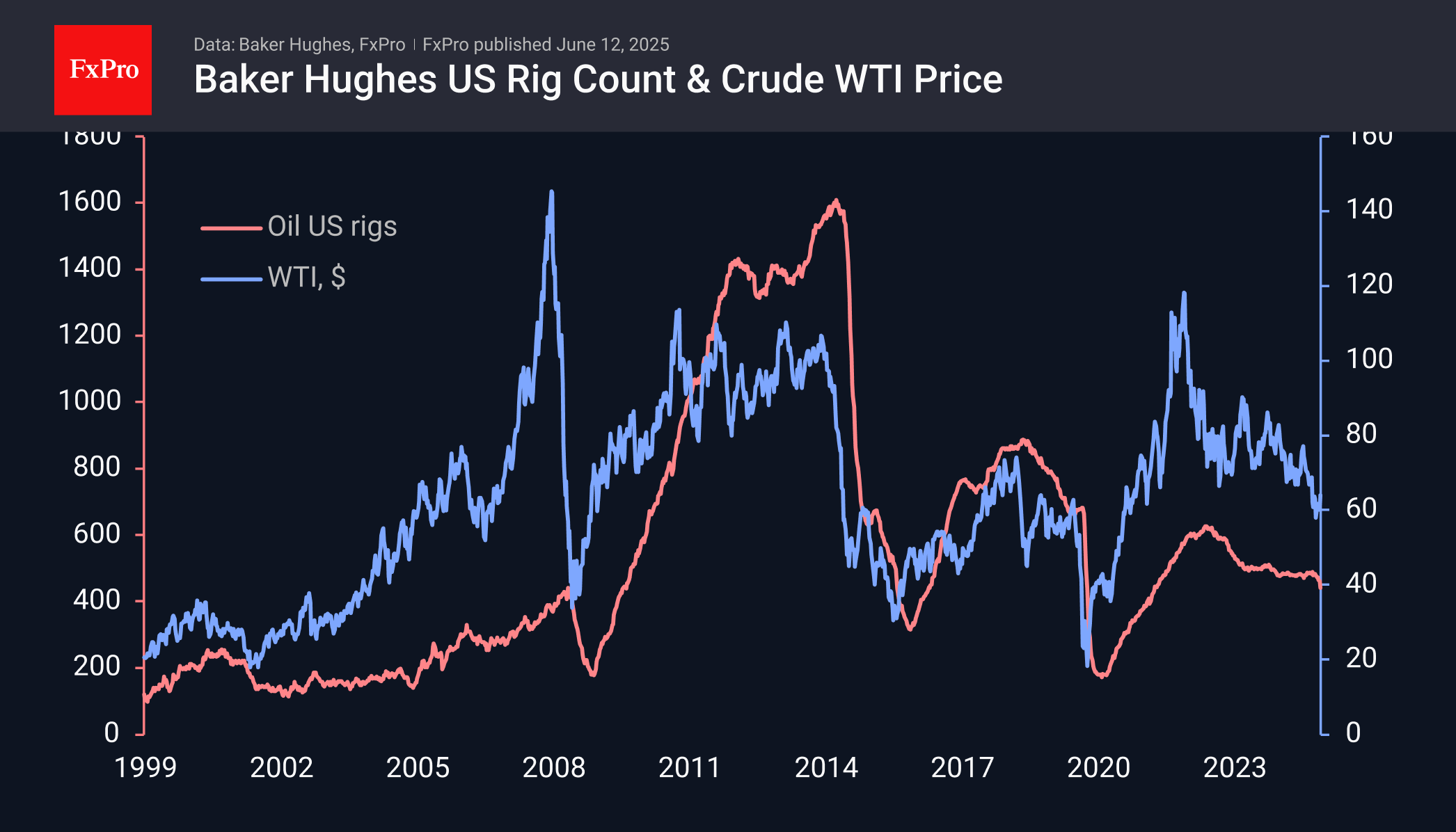 Earlier reports from Baker Hughes pointed to a significant reduction in active oil rigs to 442 (the lowest in almost four years) compared to an average of approximately 486 in March-April. This is a clear shift towards reduction after a period of stabilisation, which promises a decline in production in the coming quarters. It appears that America will return to Saudi Arabia or OPEC+, which is the market share gained after 2020.
