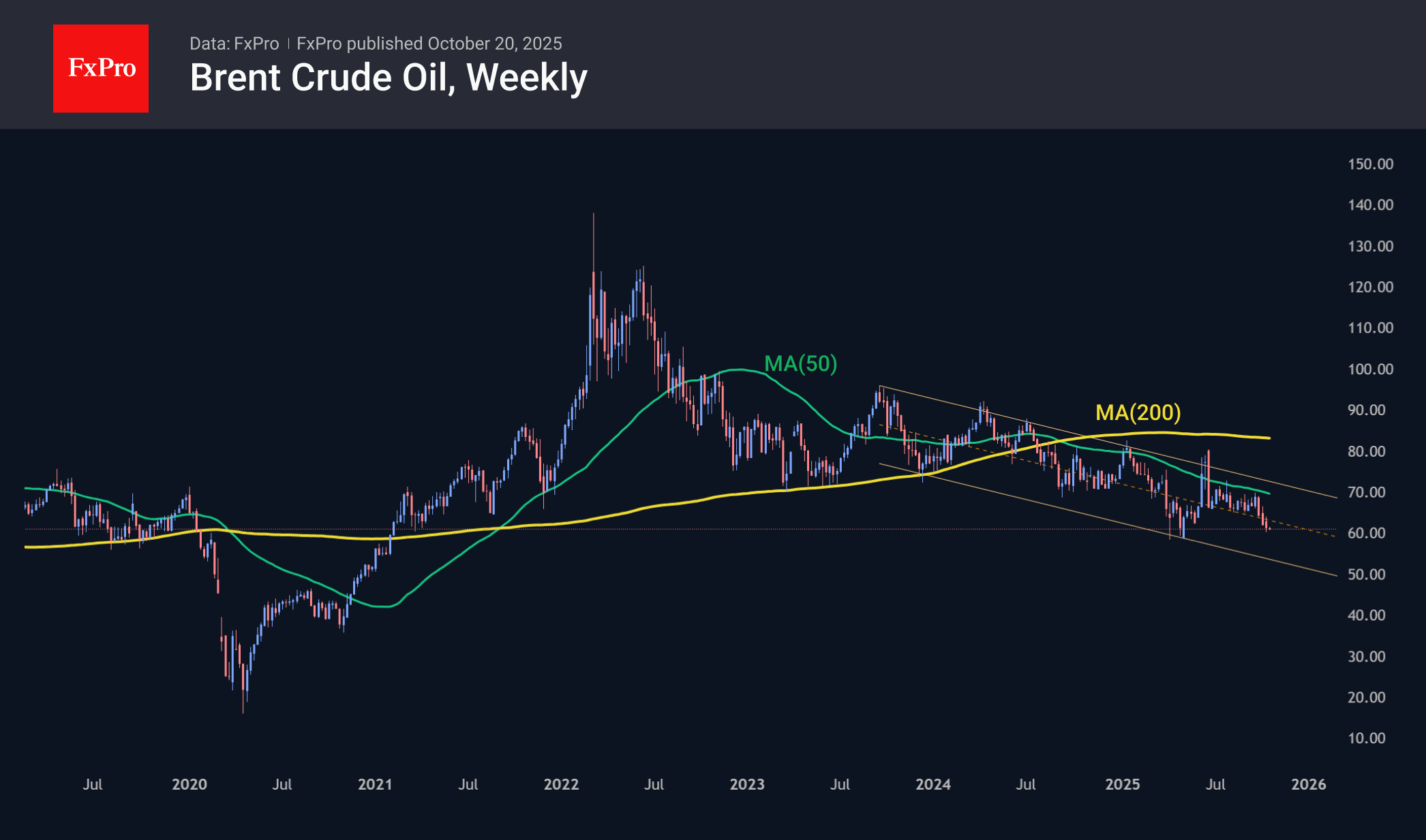 The price of oil has been in a downward channel for just over three years, and at the end of September, it accelerated its decline as it approached the 50-week moving average and the upper limit of the range. The lower limit of this range is now close to $53 per barrel of Brent, with a decline towards the end of the year closer to $50.50 against the current $61.00.