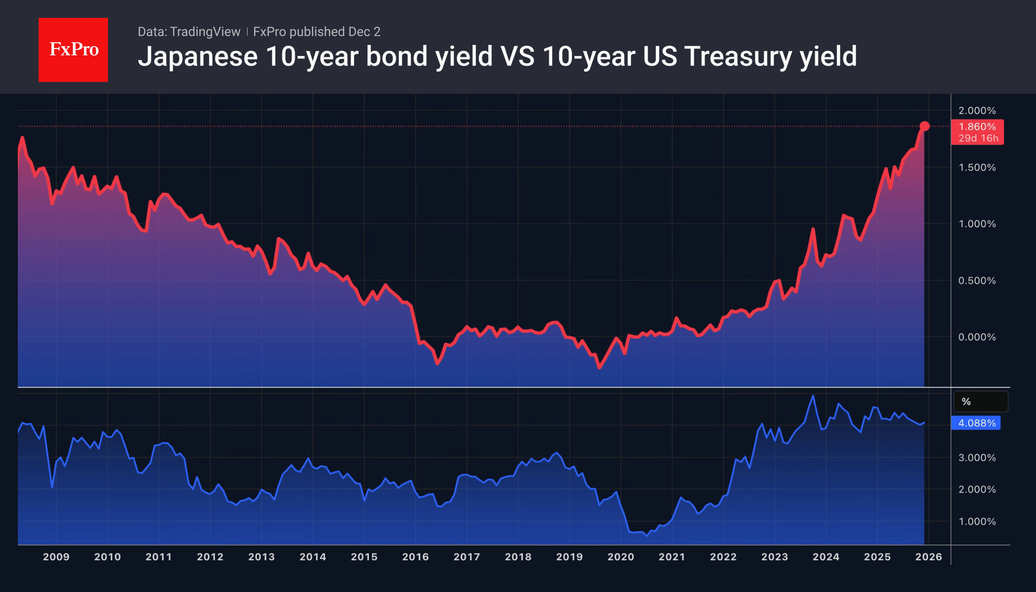 The retreat of the main currency pair from two-week highs is attributed to the rally in 10-year US Treasury yields, which have risen above 4%. Investors fear that Japan, which holds $1.2 trillion in Treasuries, will begin to dump them as local assets become more attractive and capital repatriates to its home country. The growing likelihood of a rate hike by the Bank of Japan in December amid hawkish comments from Kazuo Ueda supports this. As a result, yields on 10-year Japanese bonds have soared to their highest level since 2008.