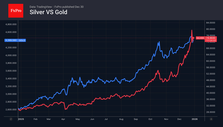 Other assets in the sector are following silver. Despite the post-Christmas sell-off, gold is heading for its second-best performance in a year in history. The first was in 1979. The XAUUSD pullback does not look like a burst bubble. The US economy risks slowing down in 2026, and the Fed may accelerate the cycle of monetary policy easing, especially under pressure from the White House.