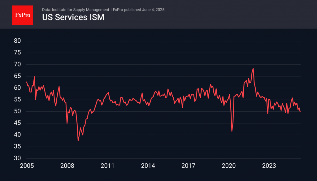 According to another report, the US services sector moved into contraction last month, as the ISM index fell to 49.9 from 51.6 a month earlier. Tariff uncertainty in April and May appears to be the main reason why order components are pulling the index down.