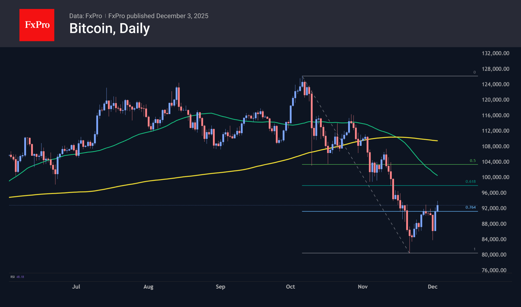 Bitcoin approached $94K on Wednesday morning, recovering half of its losses from the sell-off between November 11th and 21st. Considering the entire decline from its October peak, BTCUSD remains trading below $ 98K as part of the correction. The $98-100K range contains three psychologically significant levels: the 50-day average, early November support, and 61.8% of the decline from the peak. Consolidation above this level could convince buyers that crypto winter has not arrived.