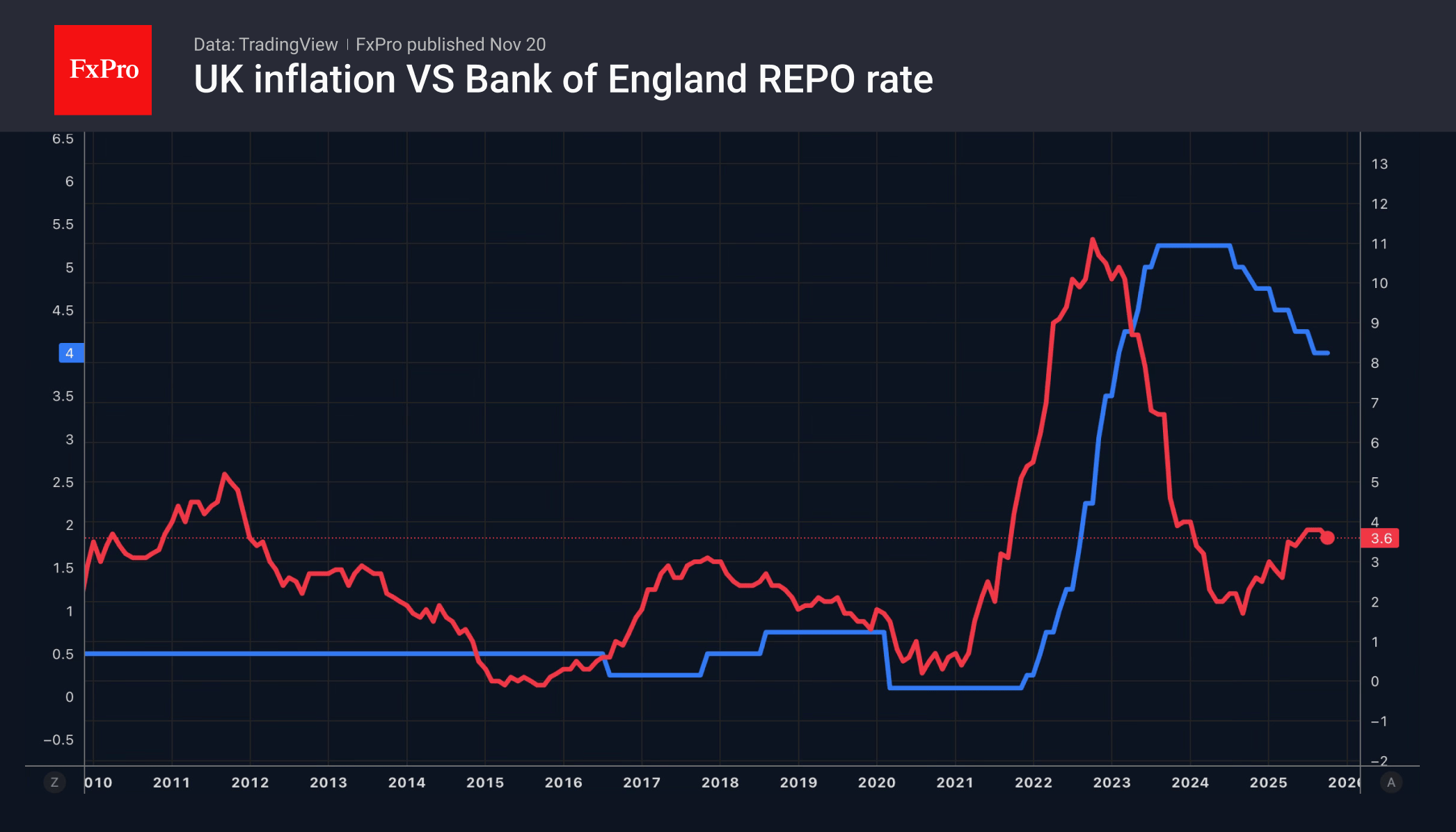 However, the USD index remains in the spotlight, partly due to the weakness of its main competitors. The slowdown in British inflation in October, from 3.8% to 3.6%, increased the chances of the Bank of England cutting its key rate in December to 0.8%. Divergence in monetary policy pushed GBPUSD below 1.31 for the second time this month, to its lowest level since April.